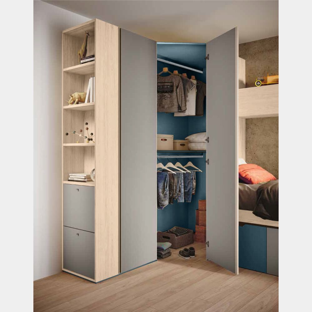 Cameretta con armadio angolare in finitura Olmo natura, Petrolio e Grigio seta