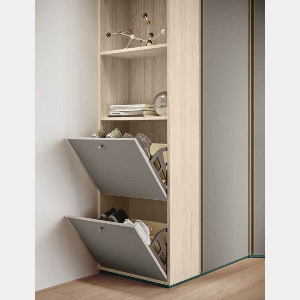 L'armadio viene fornito con un ripiani e due tubi appendiabiti per vano. E' possibile personalizzare l'allestimento interno richiedendo ulteriori ripiani o le cassettiere interne. Elemento caratterizzante dell'armadio ad angolo è la libreria terminale: 3 ripiani superiori completano due ante a ribalta per riporre le scarpe.