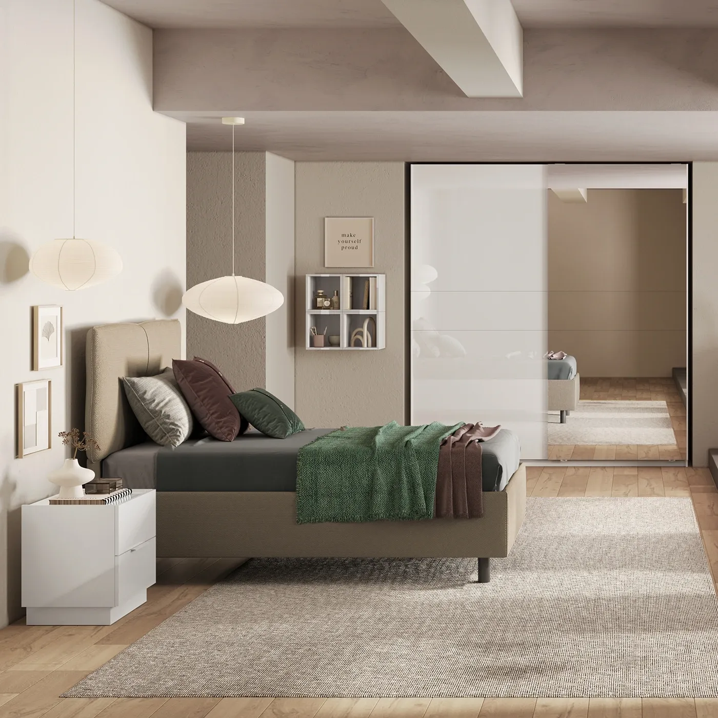 Il letto presenta un design semplice che viene valorizzato da una particolare lavorazione in testata. Il tessuto Tortora conferisce alla cameretta calore e carattere, a disposizione vi sono altre finiture per personalizzarlo.