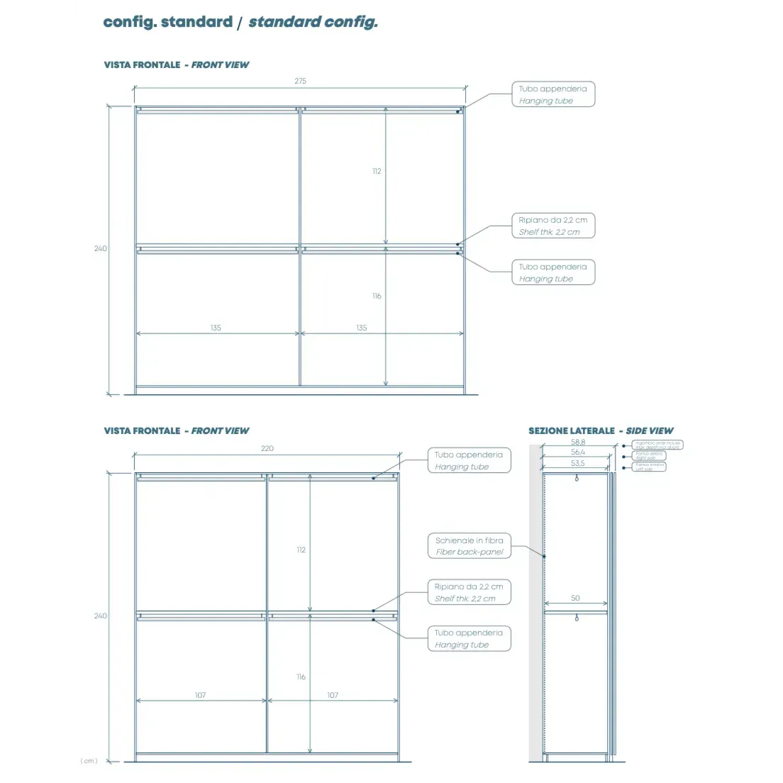 L'allestimento standard prevede un ripiano e due tubi appendiabiti per vano, è possibile richiedere tramite checkbox ulteriori ripiani, scaffalatura con cassettiera e l'illuminazione.