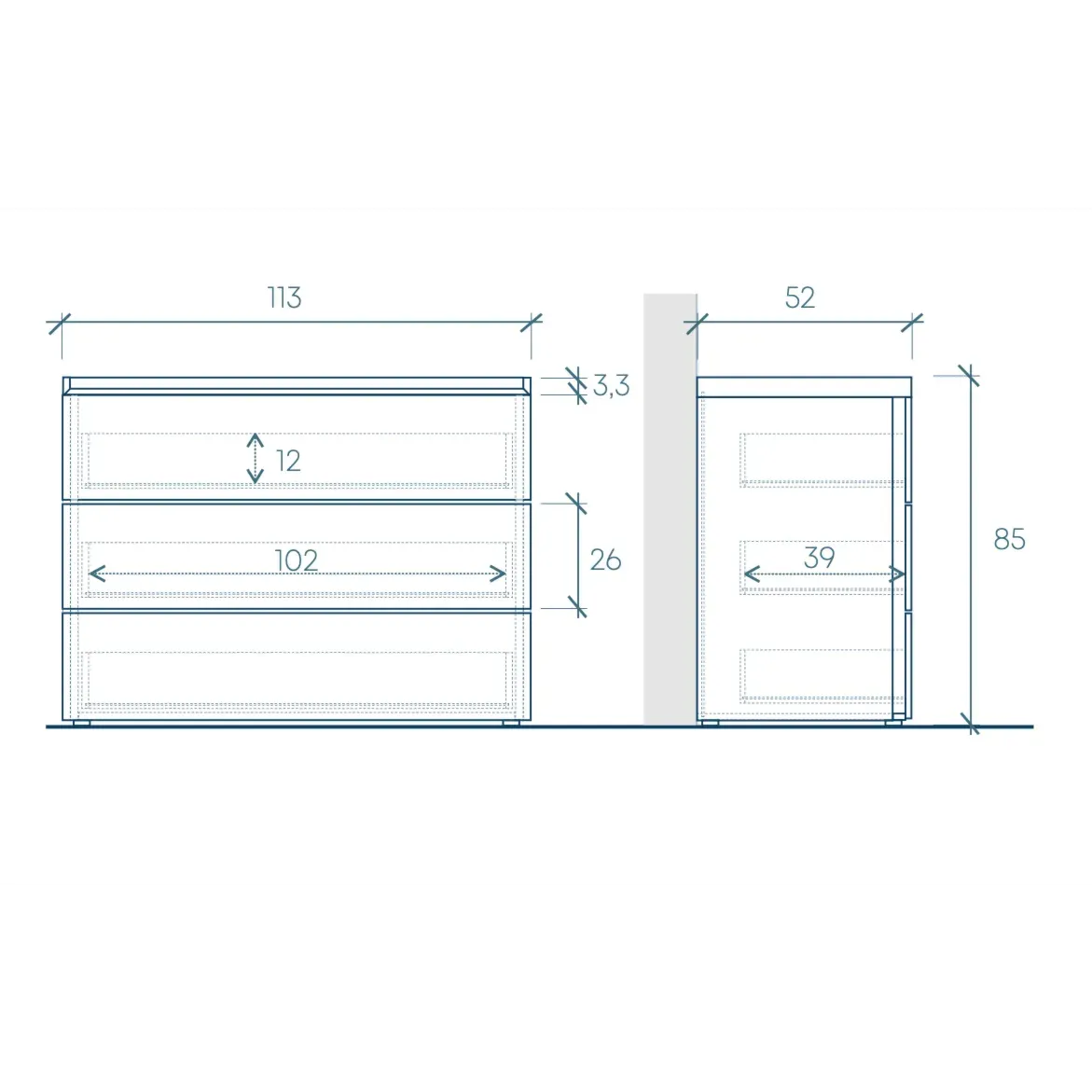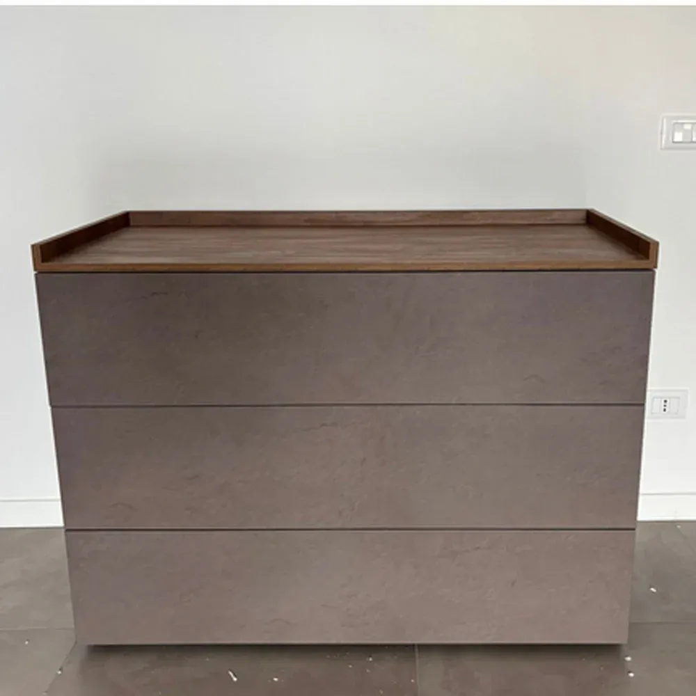 Il comodino è dotato di due cassetti e vassoio superiore, l'apertura avviene tramite presa laterale.