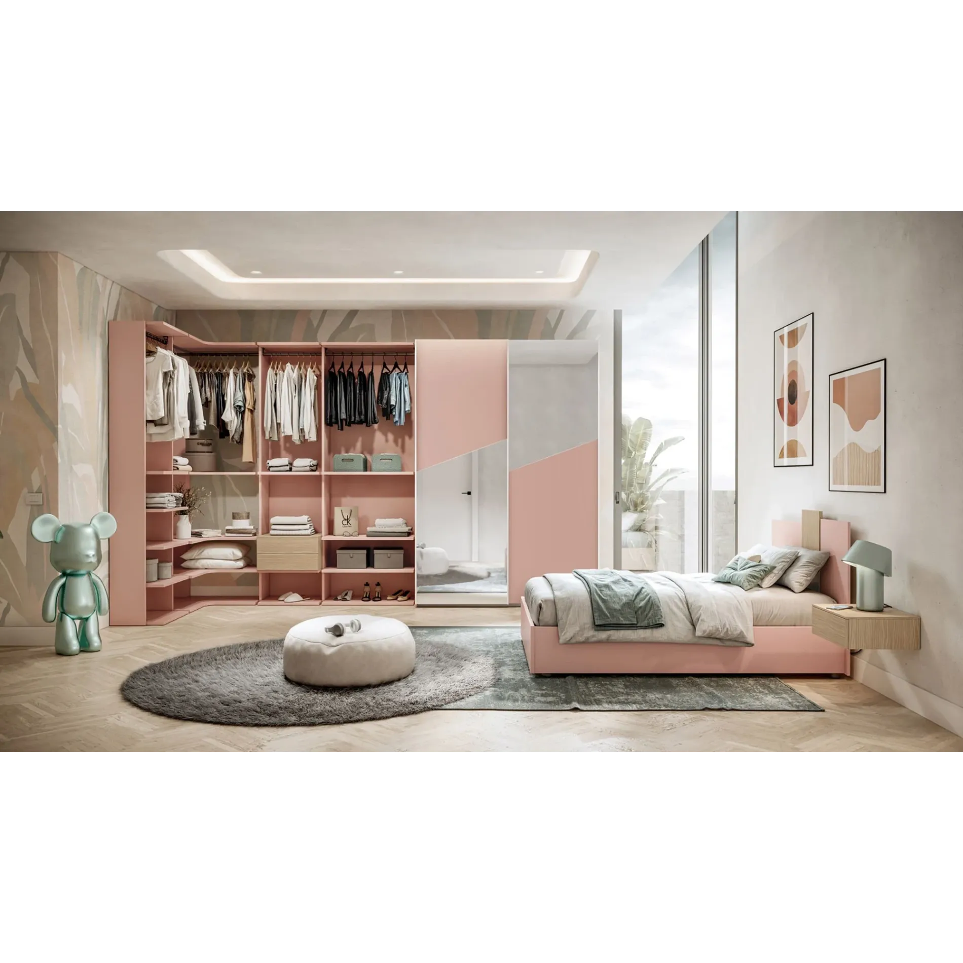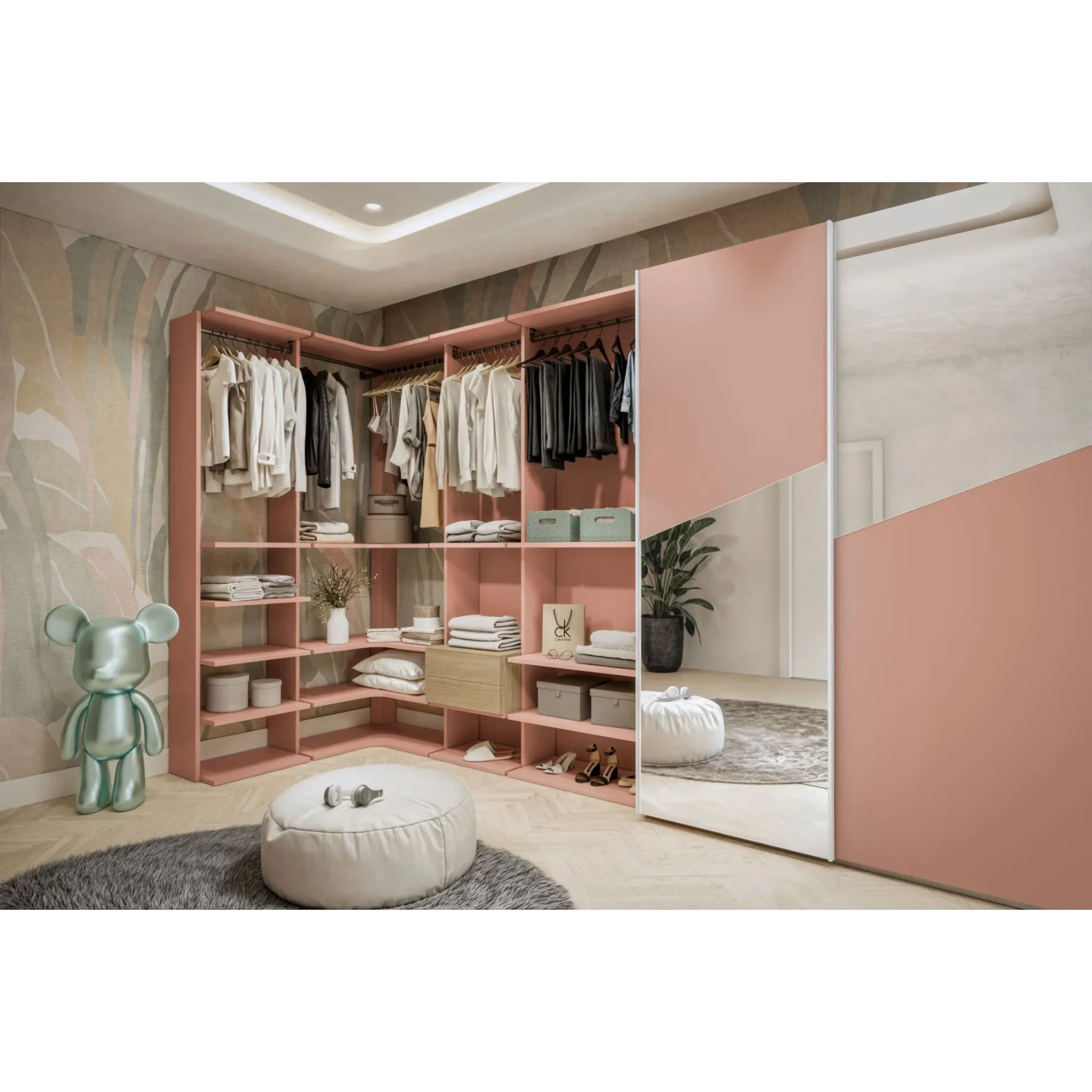 L'armadio presenta un design moderno e originale, caratterizzato da un mix di materiali e forme geometriche. Le ante sono realizzate in un colore rosa tenue, il Rosa antico, e in specchio. L'allestimento standard prevede un ripiano e due tubi per anta.