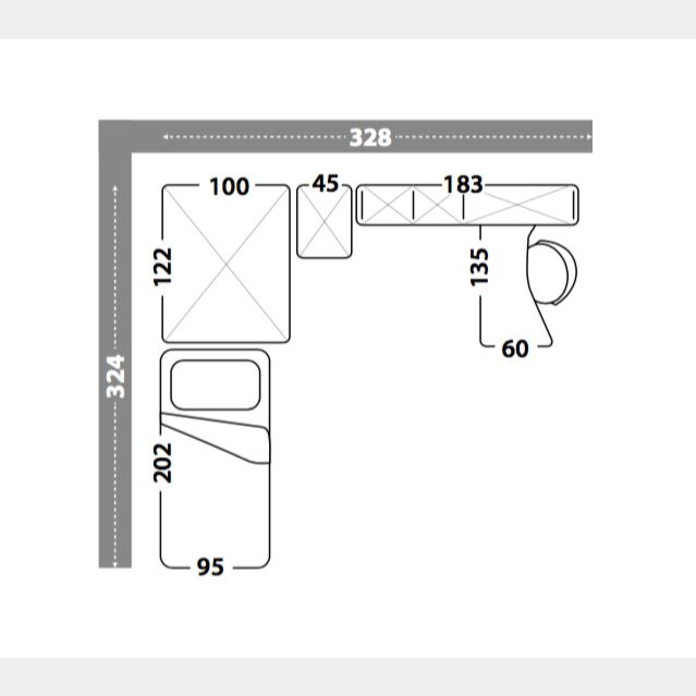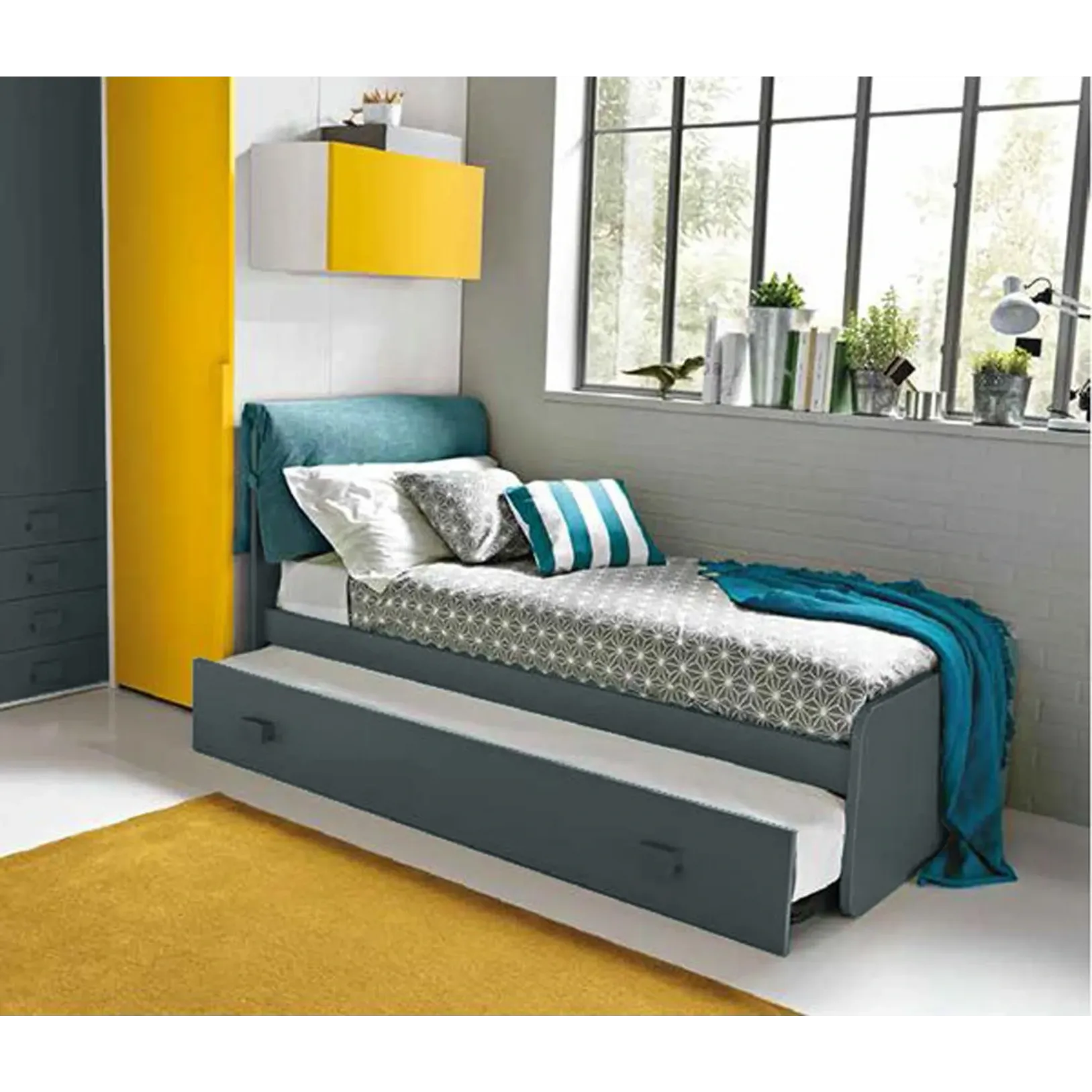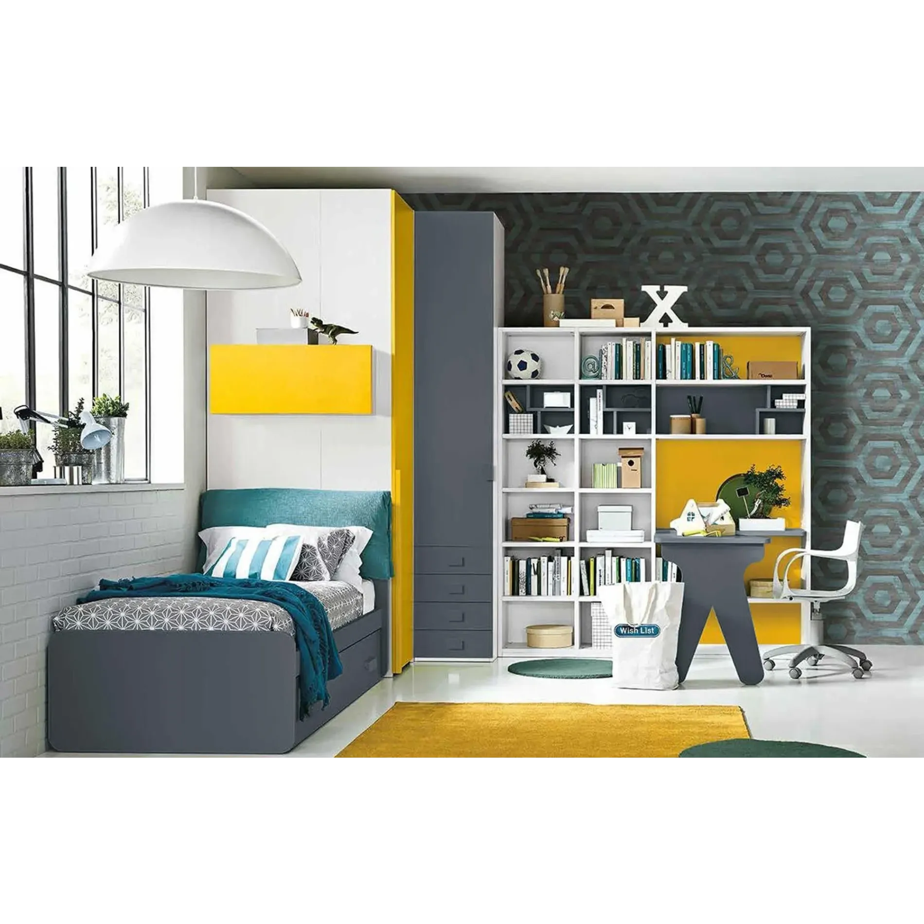 La cameretta è composta da un divano letto con secondo letto estraibile ed un armadio angolare con modulo da 45 centrimenti con 4 cassetti. Ideale per ambienti dalle dimensioni limitate l'armadio assicura un'ampia capienza sfruttando la parete al centimentro.