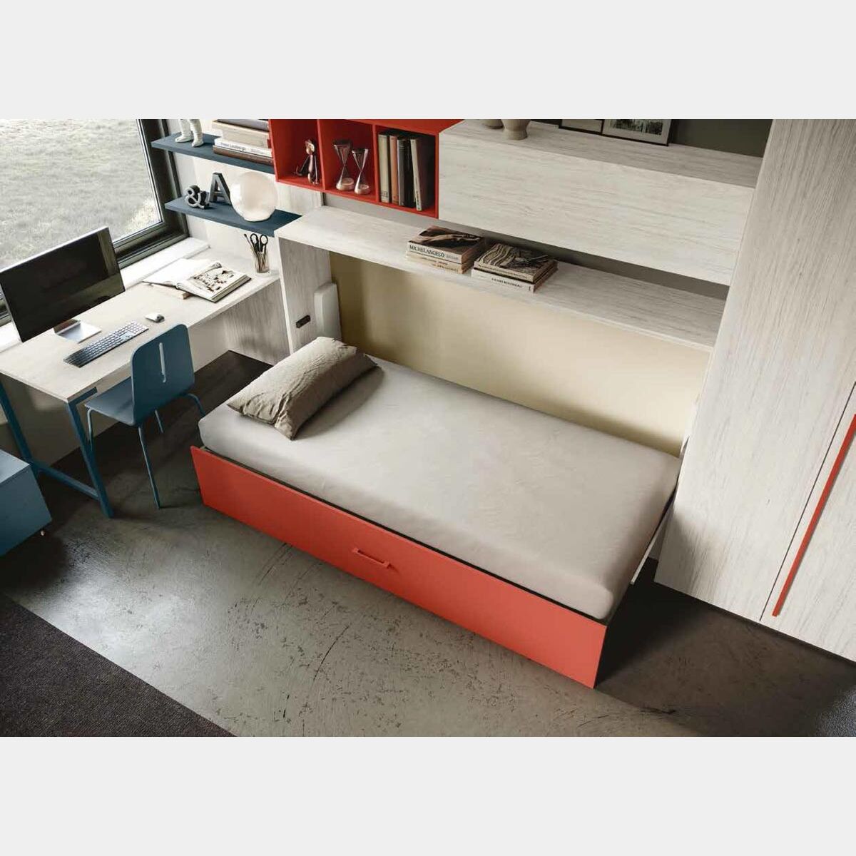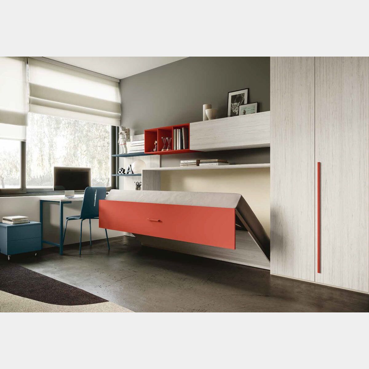 Cameretta Penelope con letto a scomparsa e armadio 2 ante, finitura Bianco Altea Corallo e Petrolio