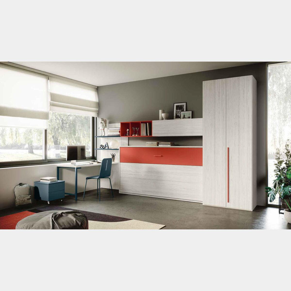 La cameretta Penelope è composta da un comodo letto a scomparsa ed un armadio a due ante ed è possibile aggiungere come optional la zona studio con i pensili sospesi.