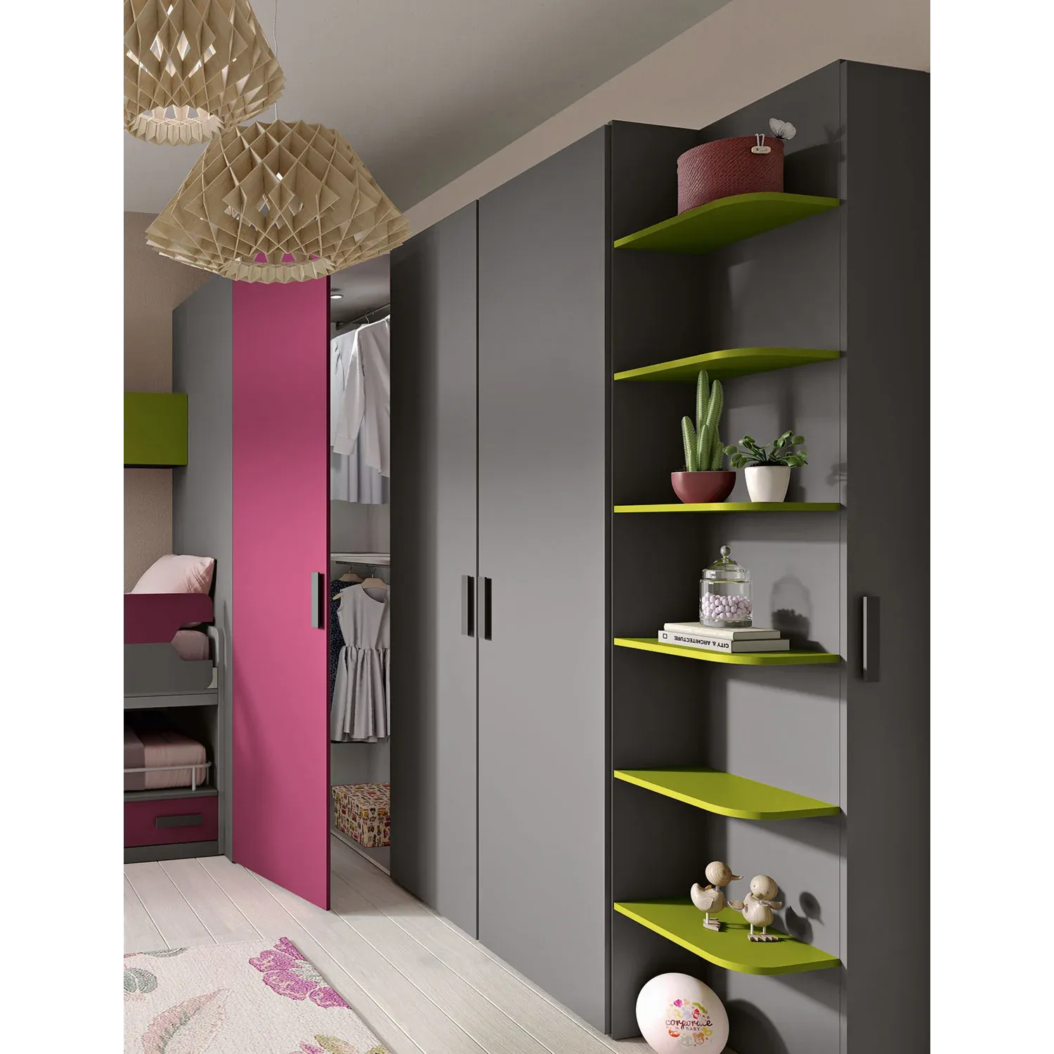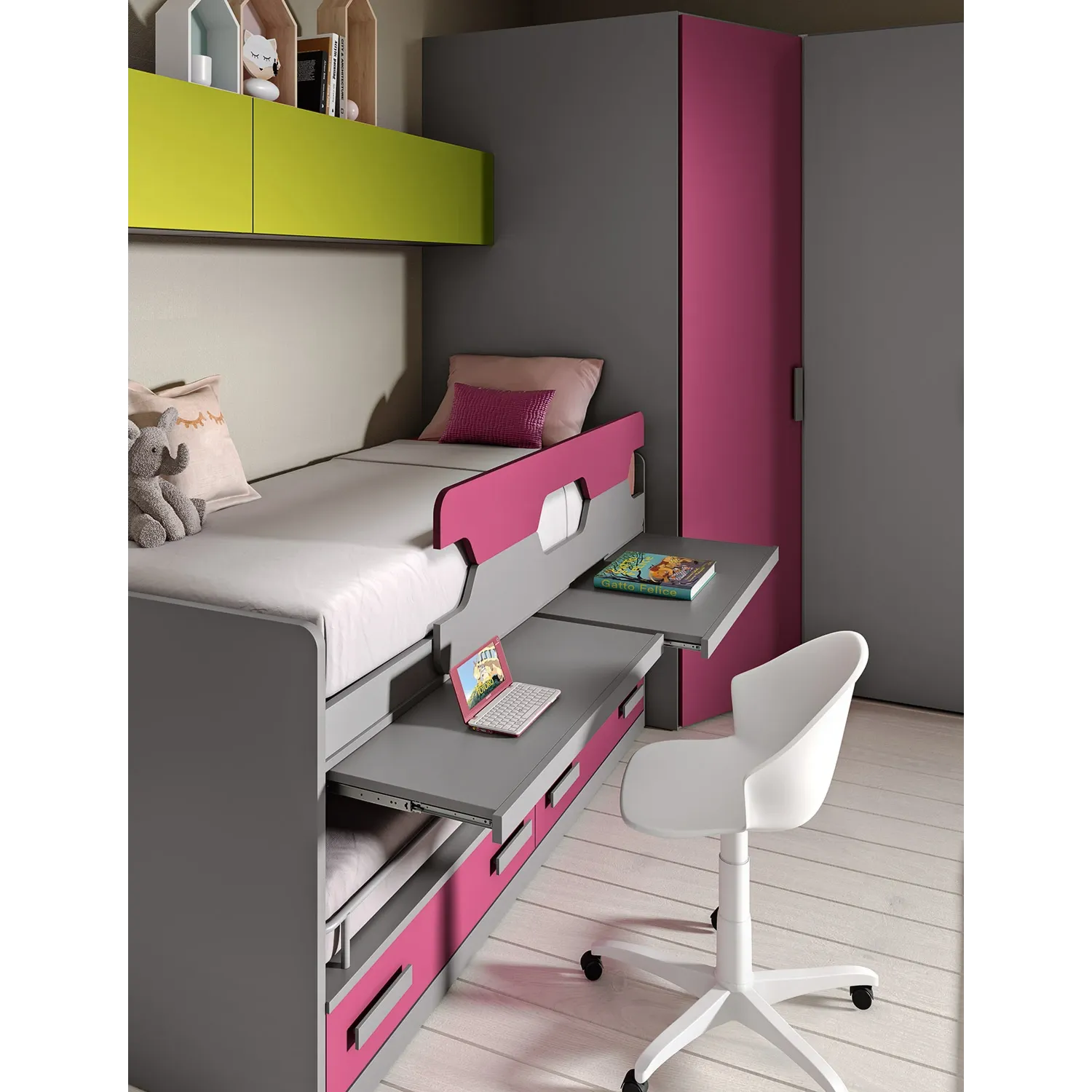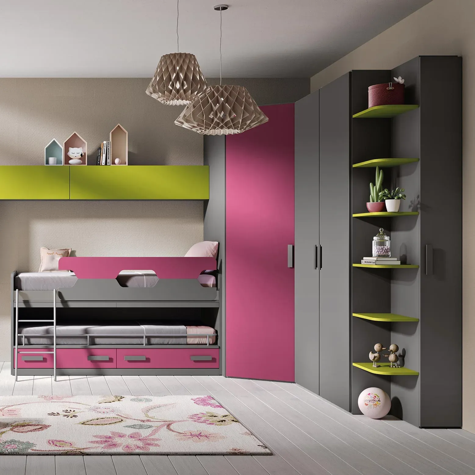 La cameretta è composta da un letto multifunzionale a due posti con scrivanie estraibili e quattro cassetti ed un'armadiatura angolare con cabina, è possibile completare la composizione con i pensili sospesi.