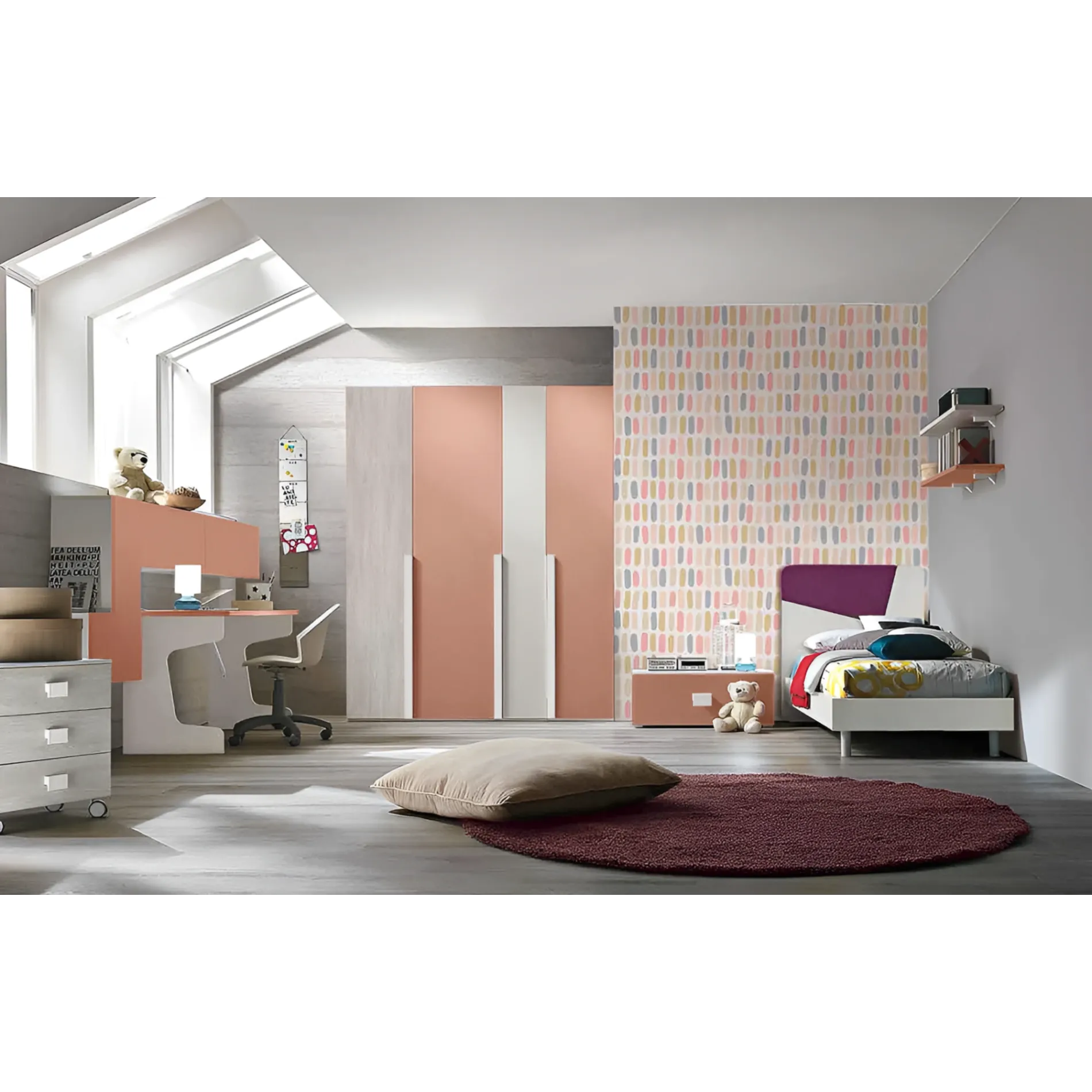La cameretta è composta da un armadio a quattro ante battenti, un comodino ad un cassetto ed un letto con inserto nella testata. E' possibile completare la composizione richiedendo tramite apposito configuratore la scrivania, la composizione di pensile sospesi e le mensole.