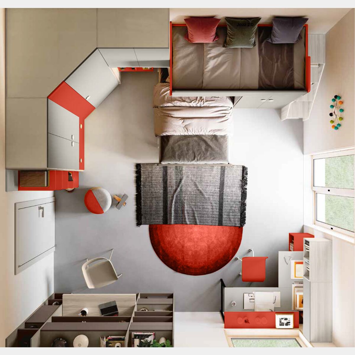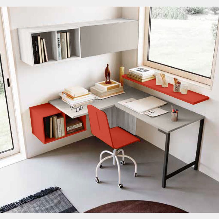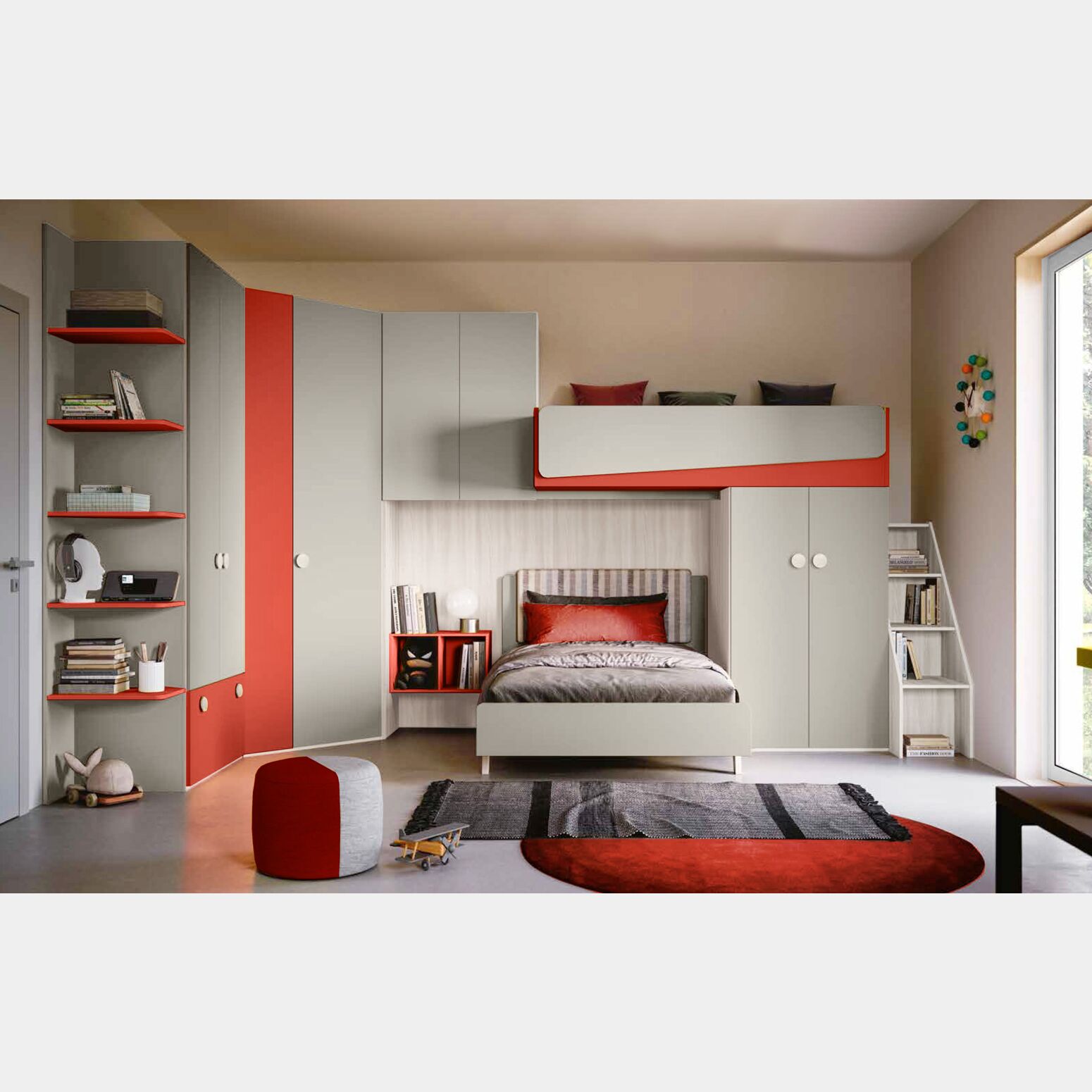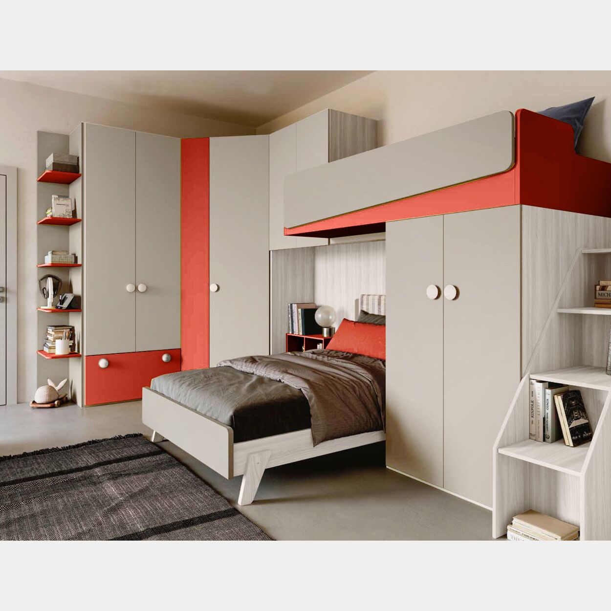 Cameretta con soppalco ad angolo, finitura Bianco altea, Grigio seta e Corallo