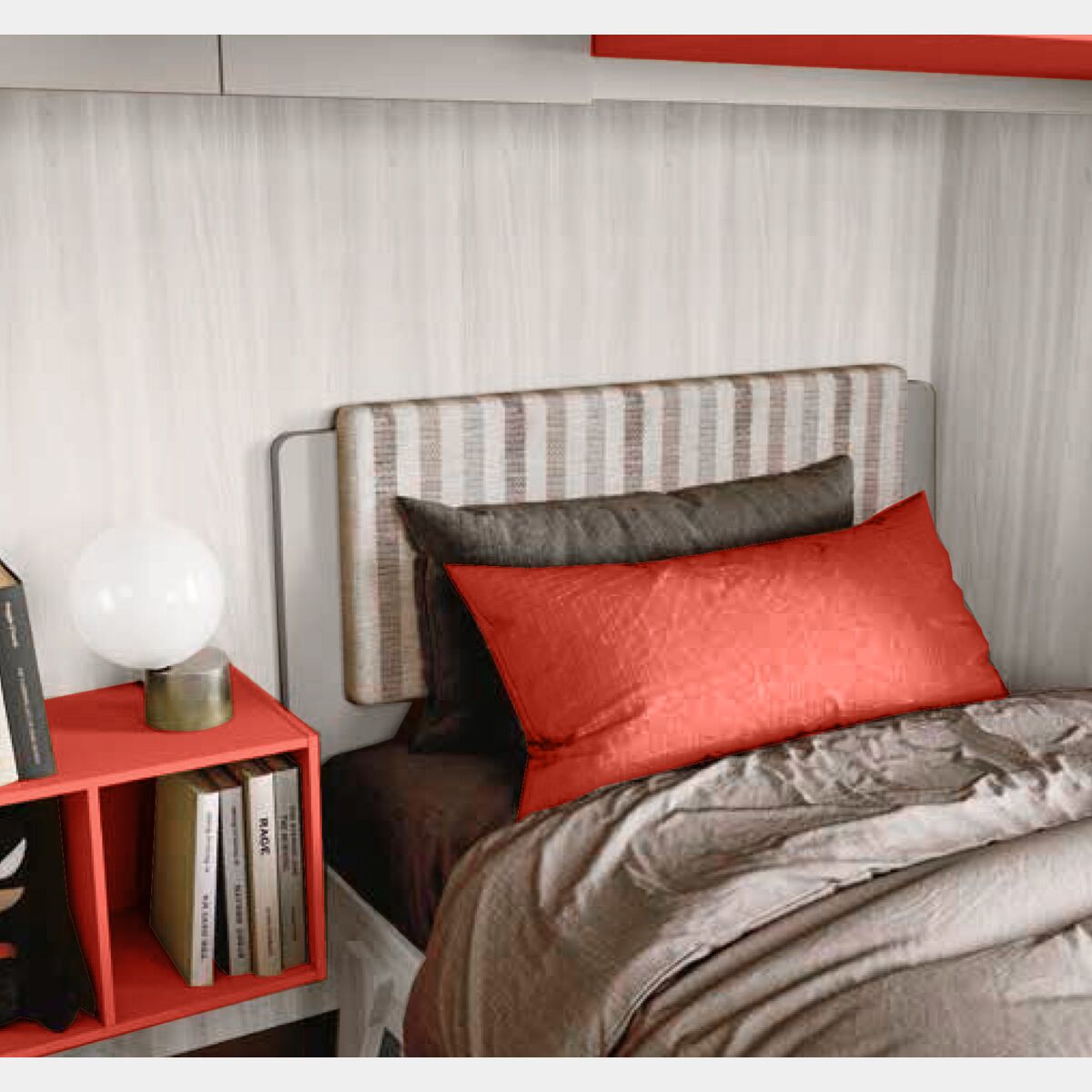 La cameretta è composta da un letto superiore (90x190) con parabordo e scaletta laterale. Come optional è possibile richiedere il letto ad una piazza e mezza (con o senza cuscino in testata), il comodino sospeso e la zona studio, o parte di essa.