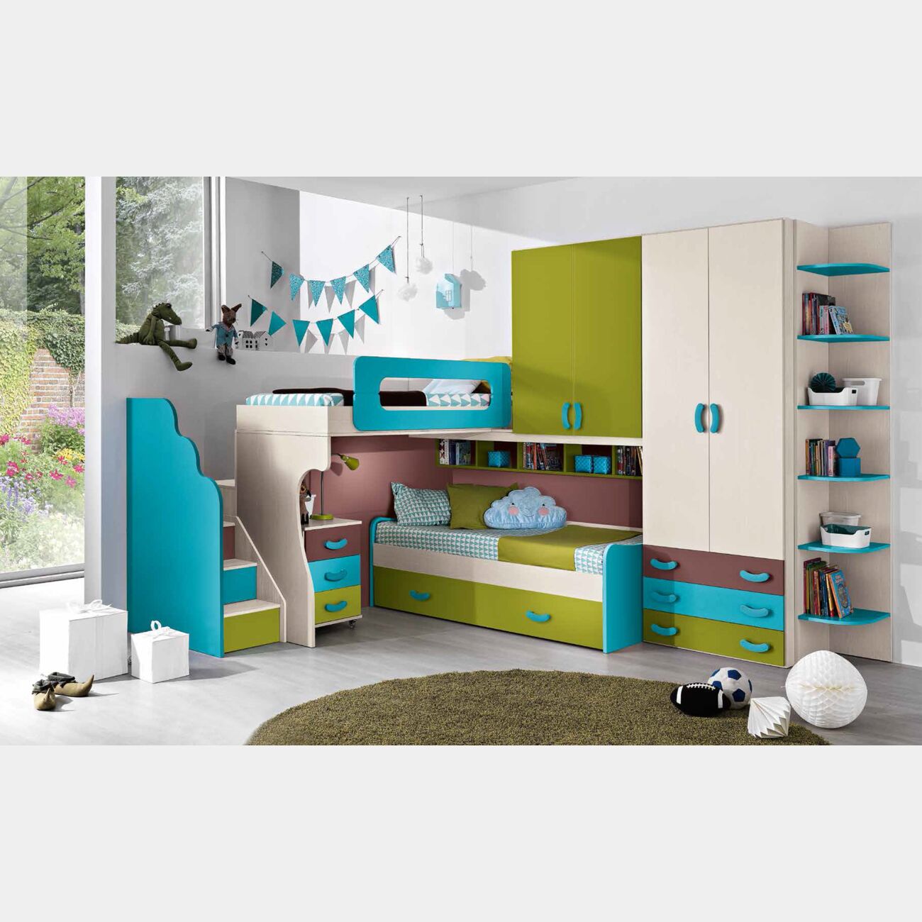 Cameretta con letto a castello Rachele, finitura Betulla, Turchese, Verde Acido e Terra Bruciata. Questa cameretta completa da bambini / ragazzi, offre un rapporto qualità/prezzo imbattibile.