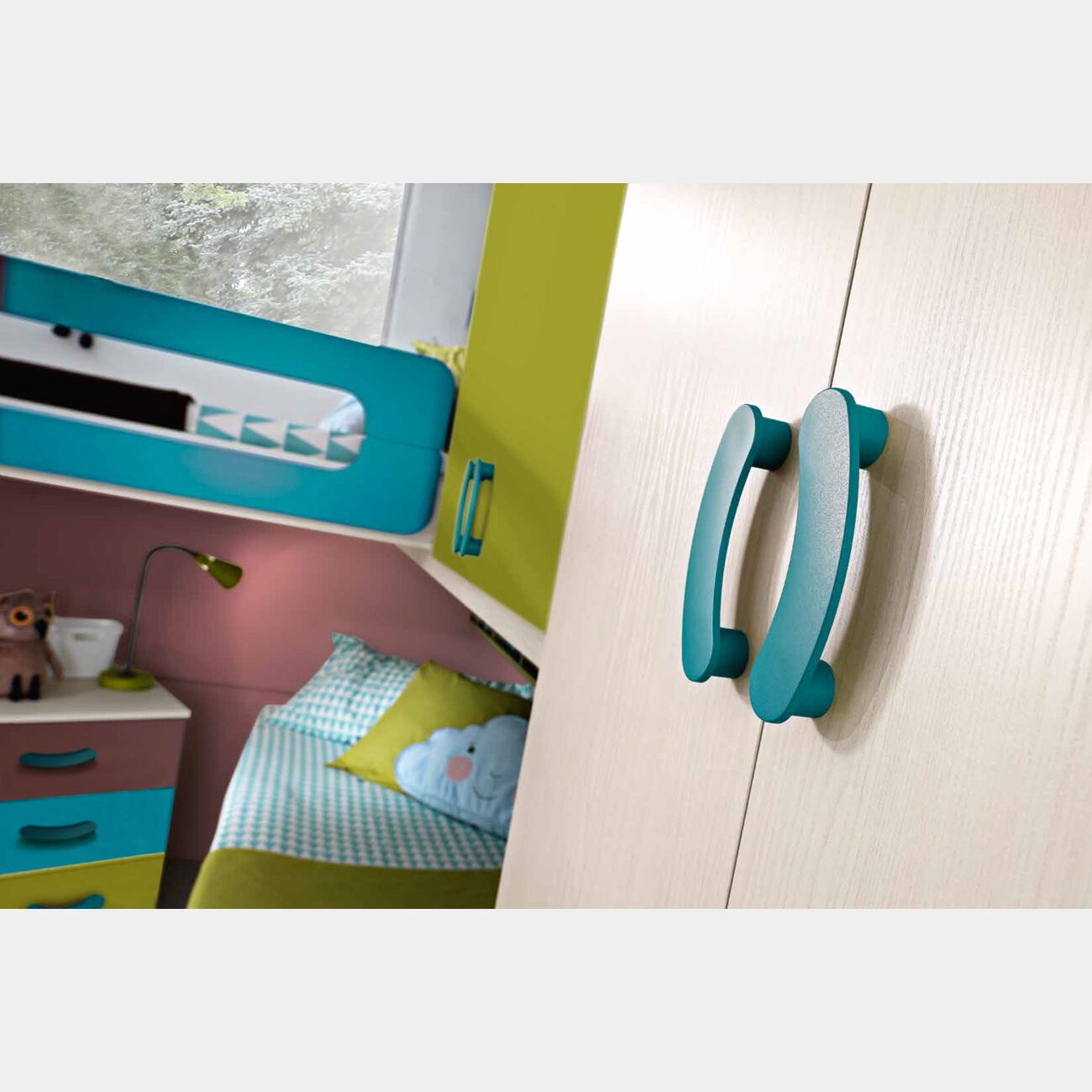 E' composta da soppalco a 4 ante e 3 cassetti. Il Soppalco ha la struttura in betulla, con schiene in terra bruciata, due ante in verde acido, due ante in betulla e cassetti terra bruciata, turchese e verde acido. Le maniglie invece sono turchese. I letti sono già forniti di rete a doghe in legno, mentre i materassi sono da aggiungere come optional