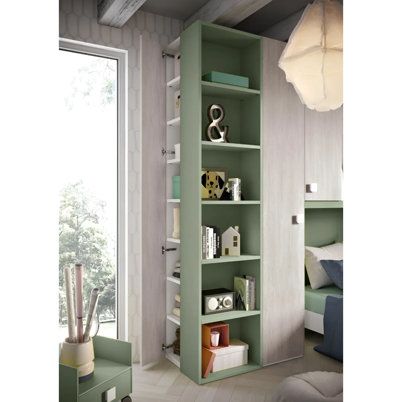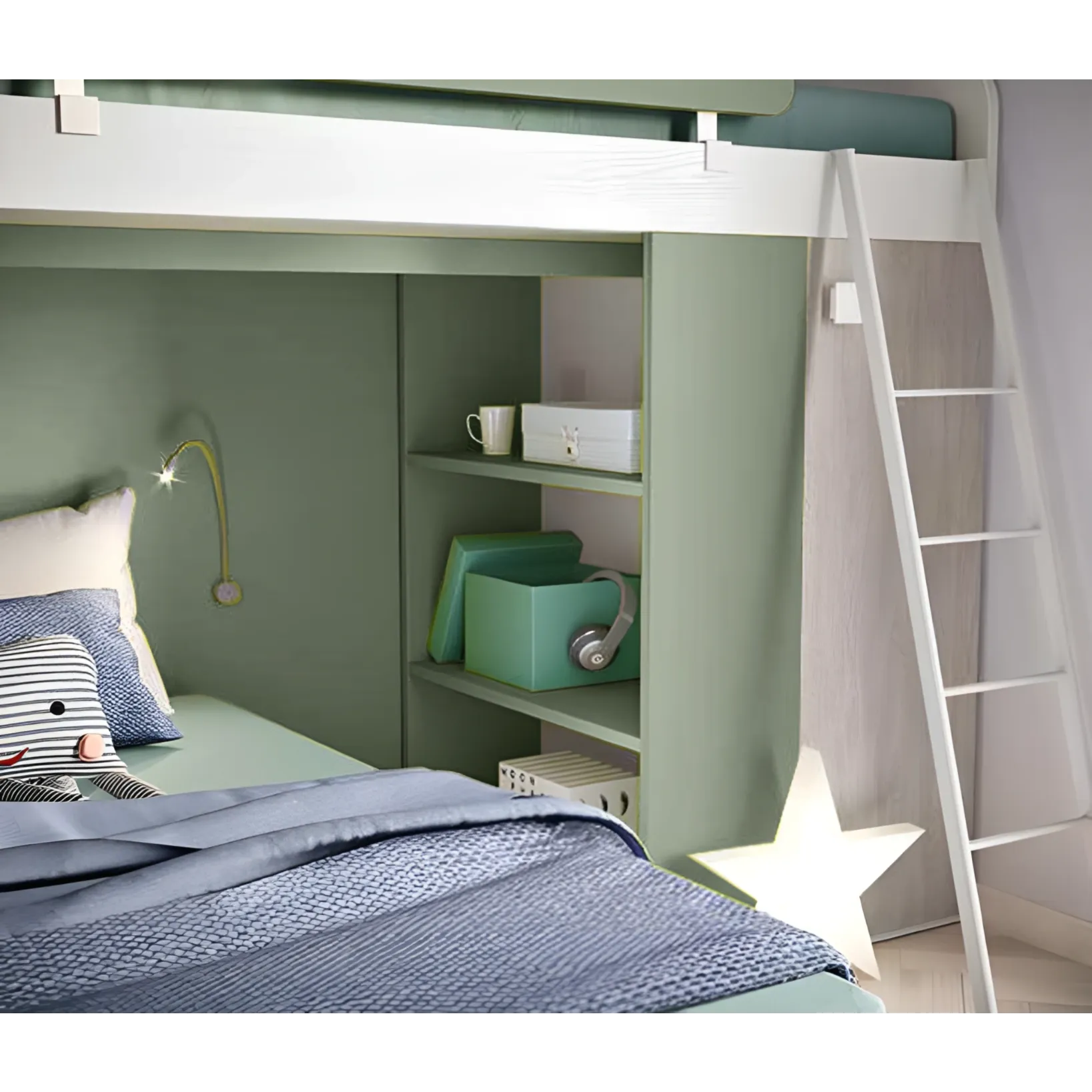 Il soppalco viene fornito con il parabordo, la scaletta in metallo e la libreria interna a 2 ripiani. A completarlo è un modulo da 45 e un terminale dotato di libreria (5 ripiani) con un'anta laterale (7 ripiani). Come optional è possibile richiedere ulteriori ripiani per il modulo di 45. Nei moduli del letto a castello vengono inseriti 3 ripiani ed un tubo appendiabiti, le cerniere hanno la chiusura rallentata.