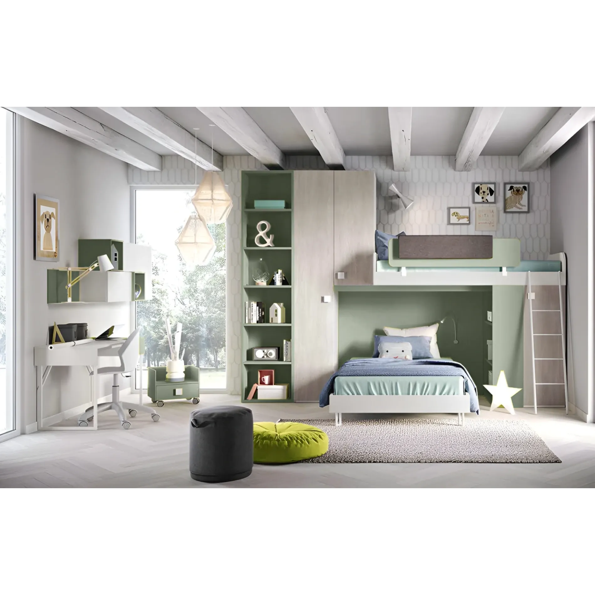 Cameretta con soppalco a 2 posti letto in Bianco frassino, Gessato cenere e Salvia