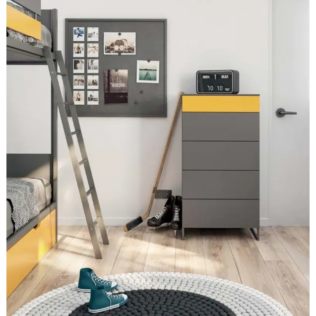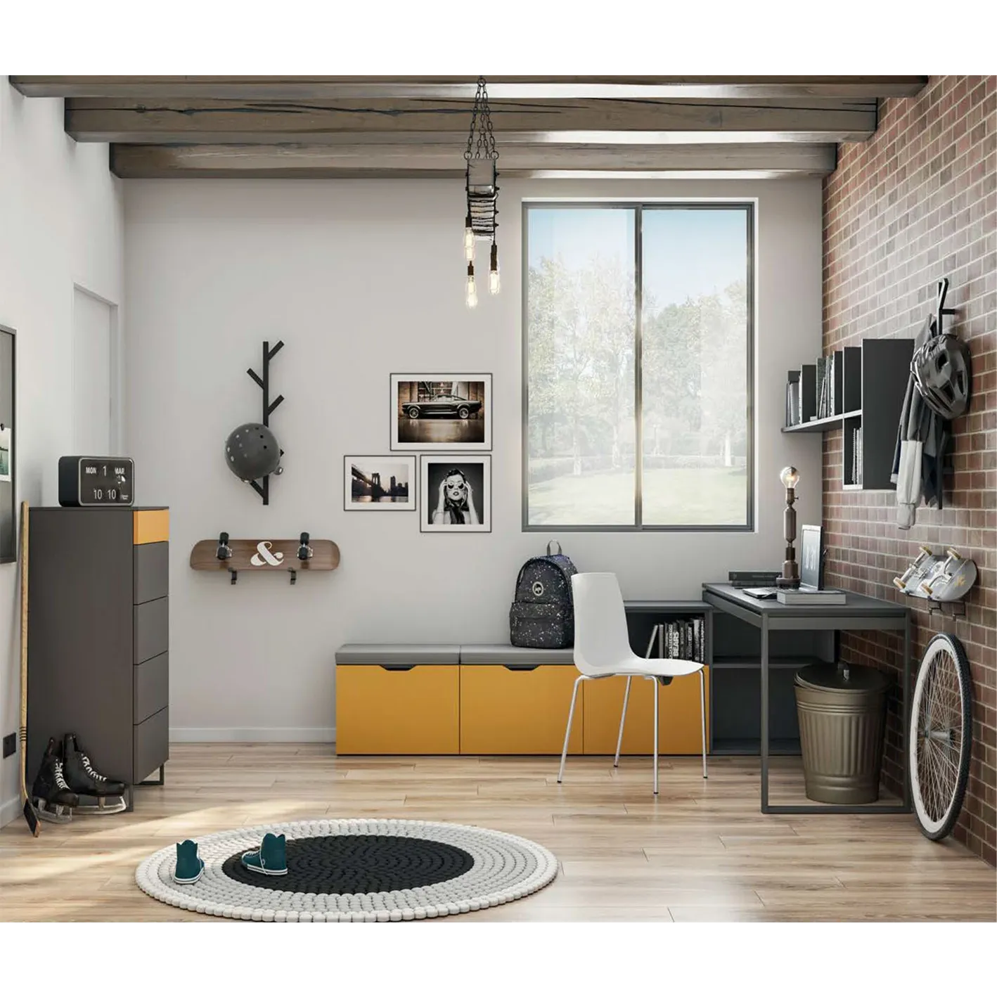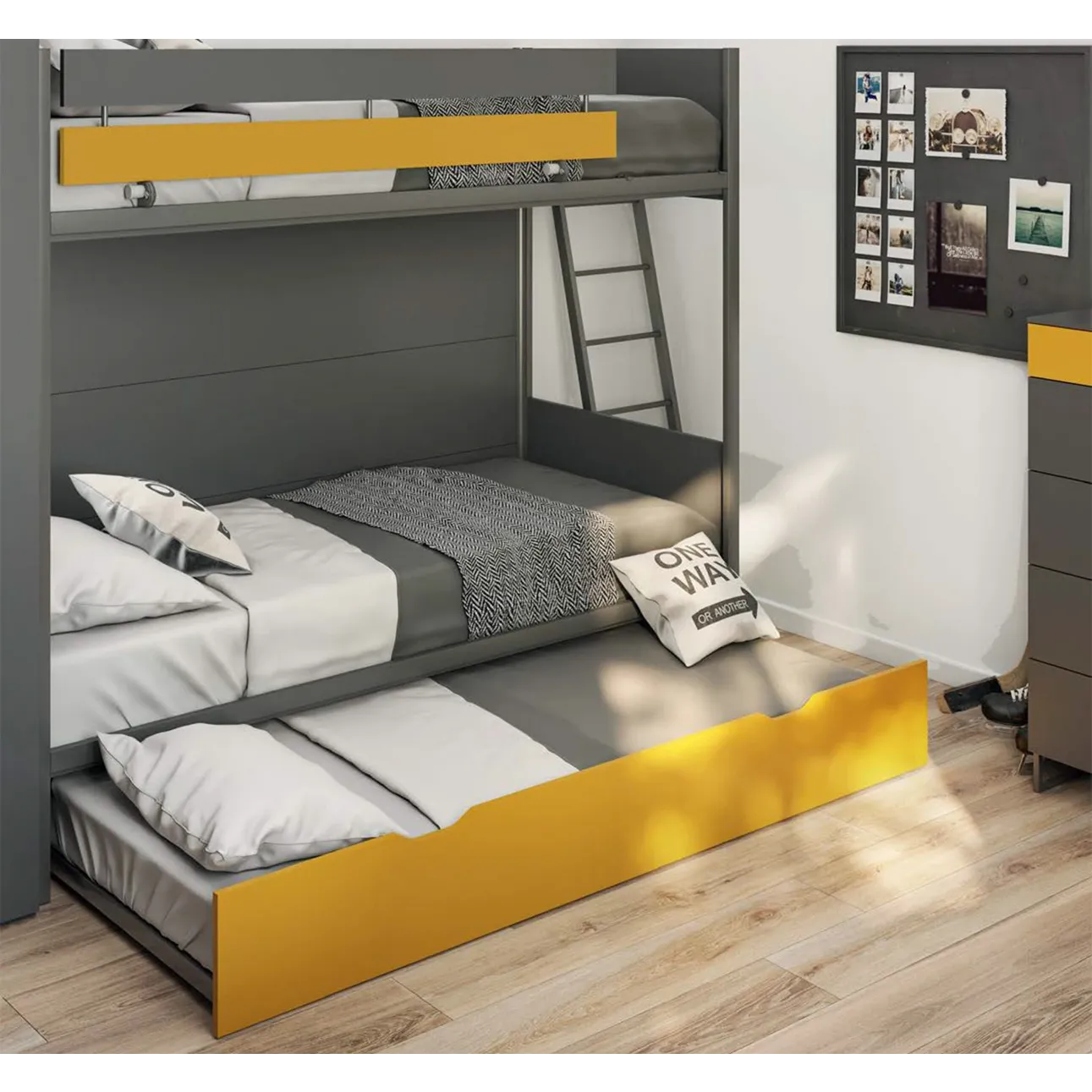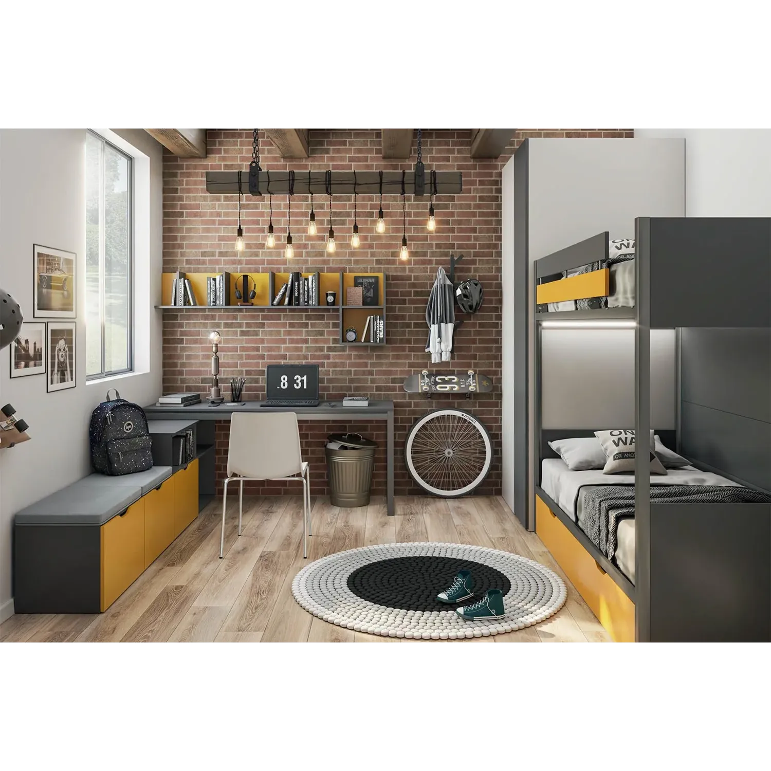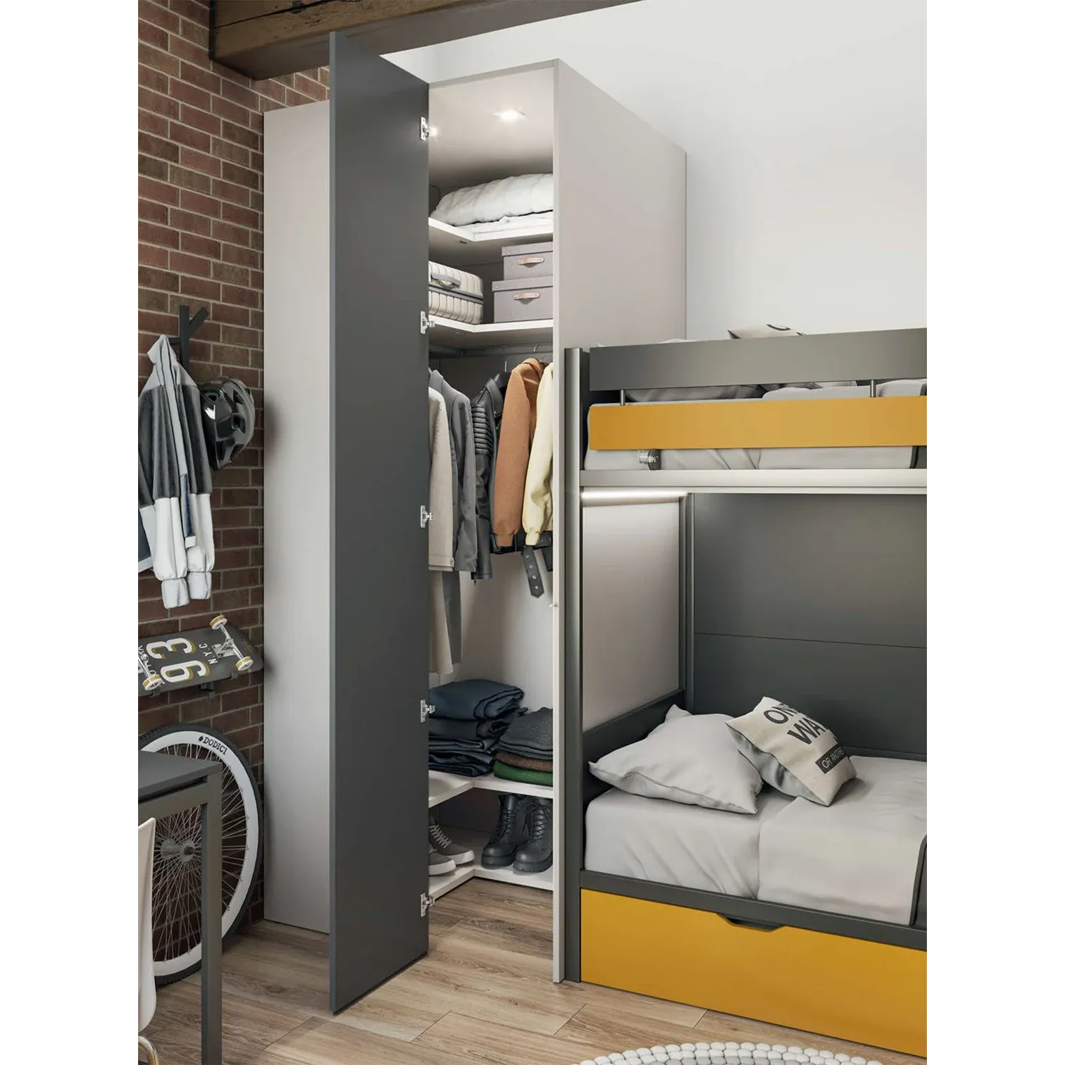 Cameretta salvaspazio per ragazzi composta da cabina armadio e letto a castello a 3 posti, possbilità di aggiungere zona studio e mensole, finitura Quarzo, Antracite e Ocra. Vedi tutta la collezione qui