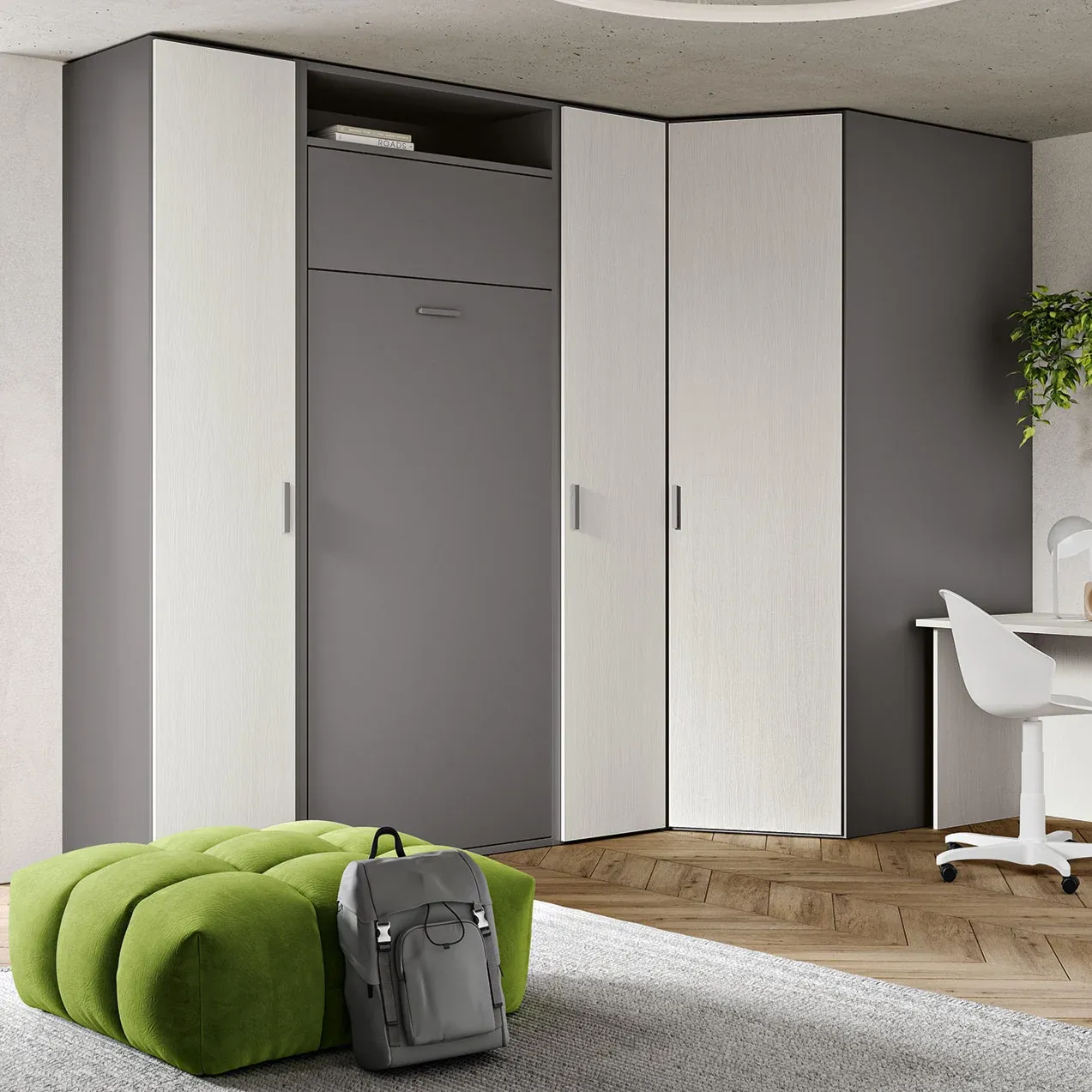 Capiente e funzionale l'armadiatura è progettata per camerette dalle dimensioni limitate, che necessitano di un posto letto al bisogno.