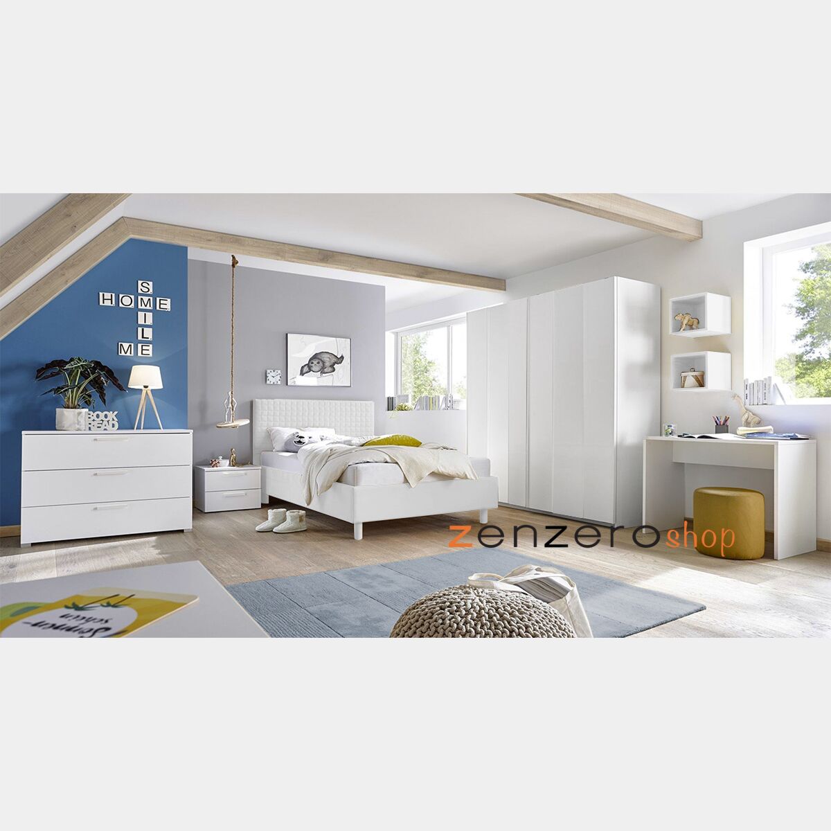 Cameretta moderna per ragazzi completa di letto con testiera ecopelle color bianco, armadio a 2 ante scorrevoli, comodino a 2 cassetti, comò a 3 cassetti, scrivania e coppia vani a giorno color bianco.