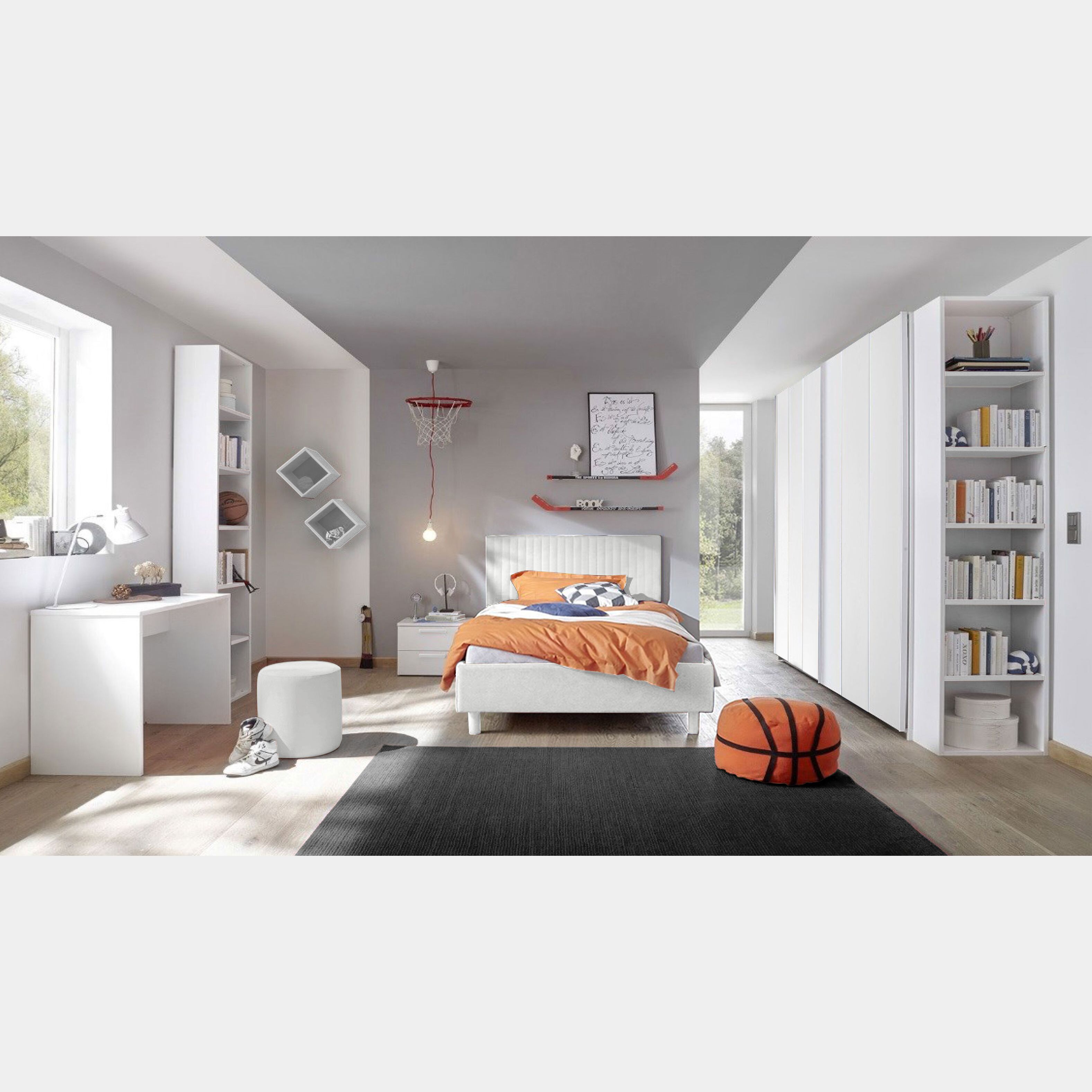 Cameretta moderna per ragazzi completa di letto ad una piazza e mezza in ecopelle con testiera color Bianco, armadio con ante scorrevoli, comodino con maniglia Bianca in legno e due cassetti.
