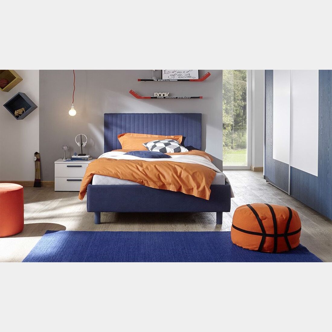 Cameretta moderna per ragazzi completa di letto ad una piazza e mezza con testiera imbottita color Blu, armadio con ante scorrevoli, comodino con maniglia Blu in legno e due cassetti.