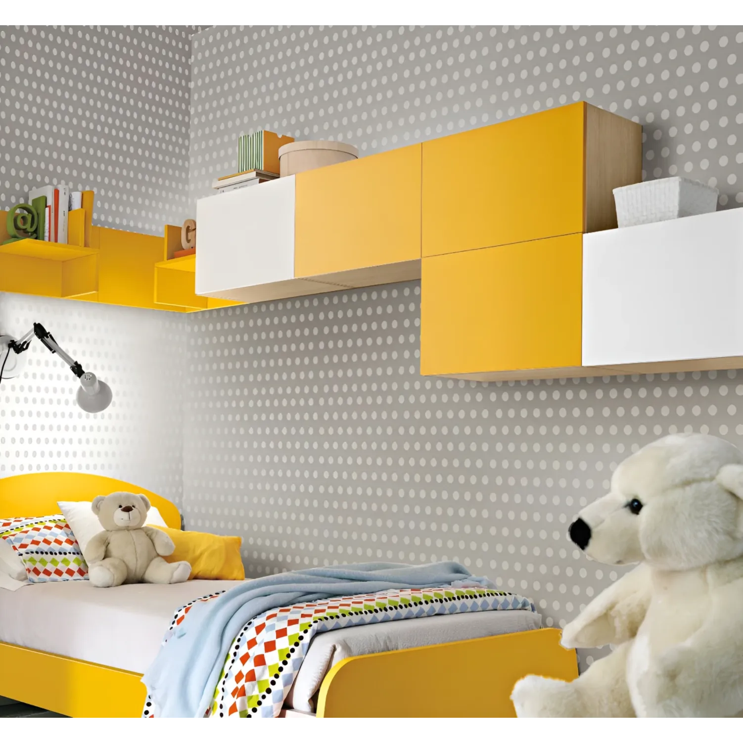 Una moderna soluzione per arredare la stanzetta di tuo figlio è la cameretta in Girasole. Allegra e accogliente unisce la praticità ad un design a portata di bambino.