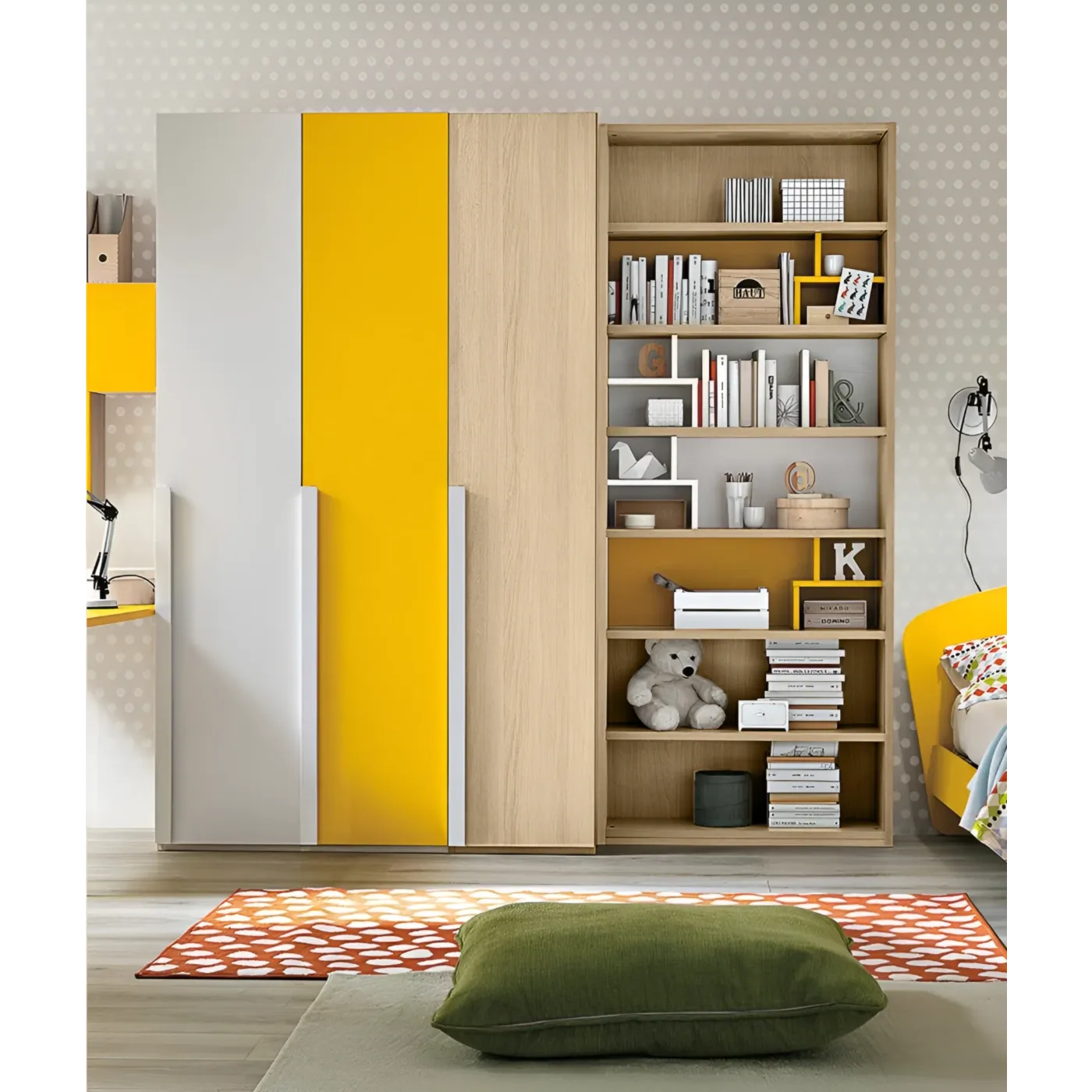 L'armadio presenta 3 ante battenti da 45 cm ciascuna. L'allestimento di base prevede un ripiano per vano e 2 tubi appendiabiti, vengono forniti i piedini livellatori e cerniere con chiusura rallentata. A fianco è presente la libreria con colorati divisori centrali che la valorizzano.