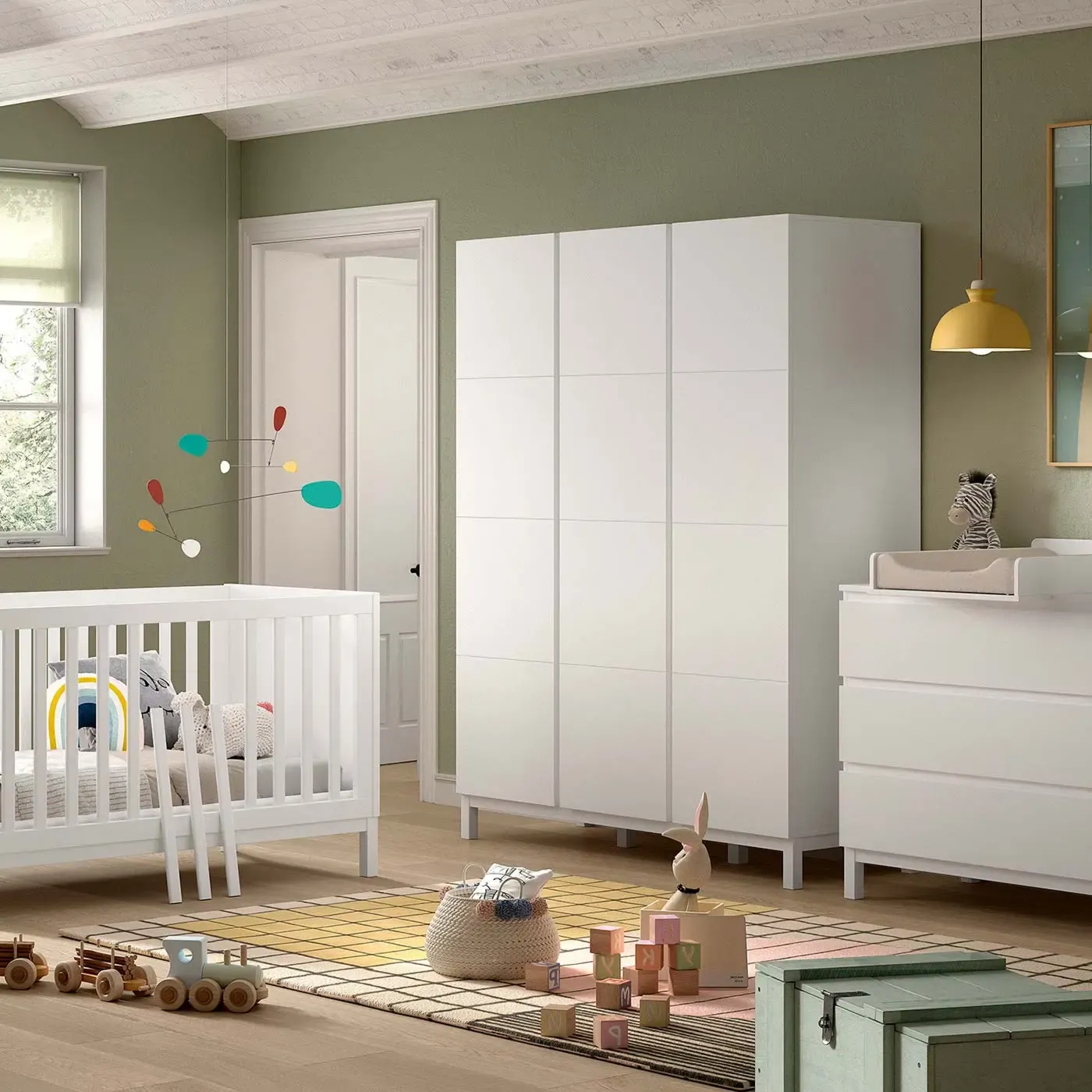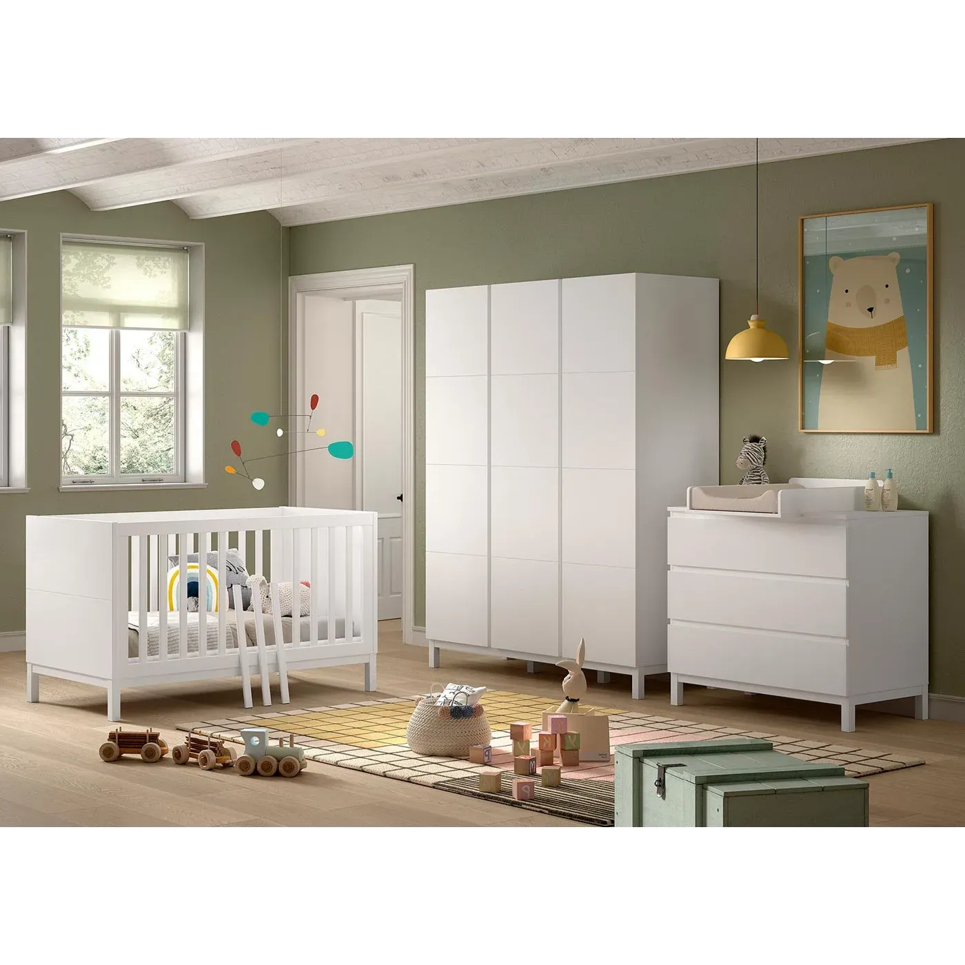 Esso si costituisce di un lettino munito di rete a doghe regolabile su 3 altezze, con in aggiunta la possibilità di rimuovere 3 delle sbarre e persino uno dei lati per trasformarlo in lettino per bambini più grandi, rendendolo un prodotto più versatile a seconda delle esigenze del tuo bambino in crescita; di una cassettiera con 3 cassetti a chiusura ammortizzata, molto spaziosi per l'archiviazione di oggetti essenziali, e con sistema antiribaltamento; di un armadio a 3 ante provvisto di 5 ripiani e tubo appendiabiti che offrono molto spazio per riporre vestiti, biancheria da letto e altro ancora.