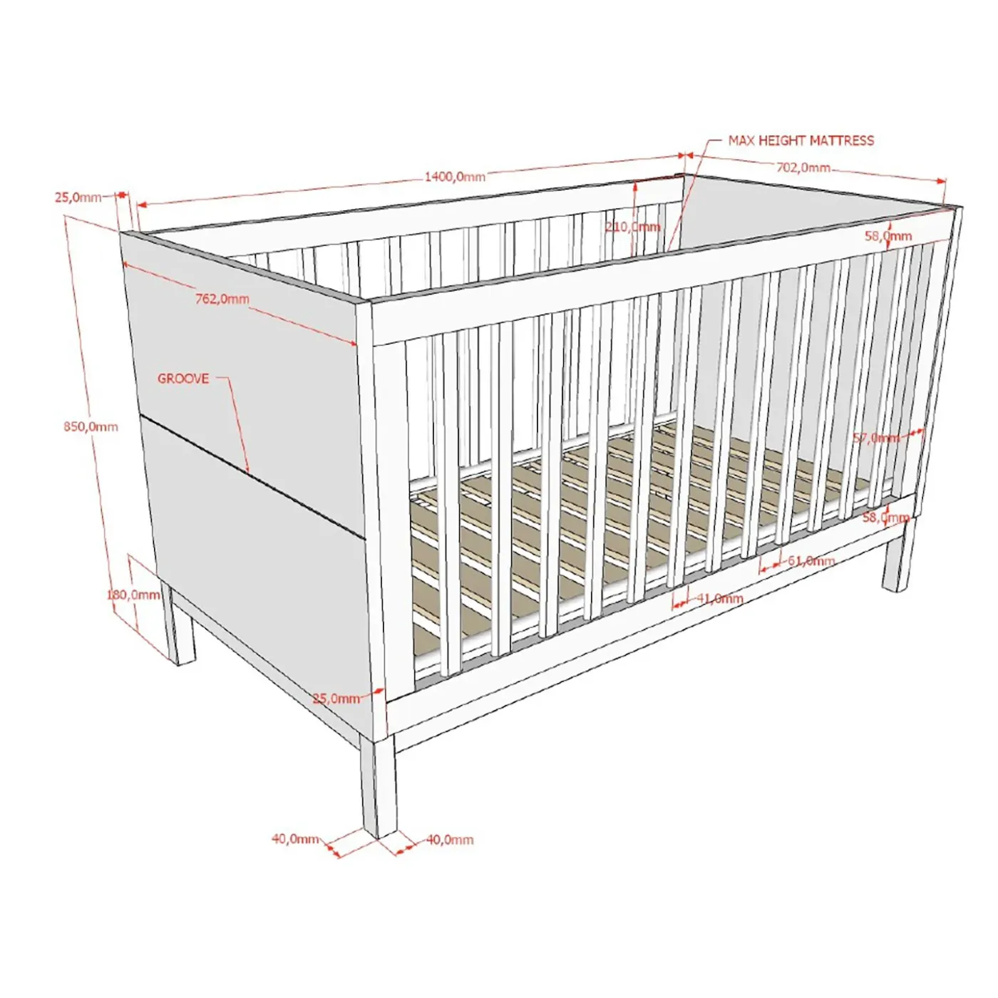 - Lettino con 3 sbarre e lato rimovibili e rete a doghe 70x140 regolabile su 3 altezze diverse