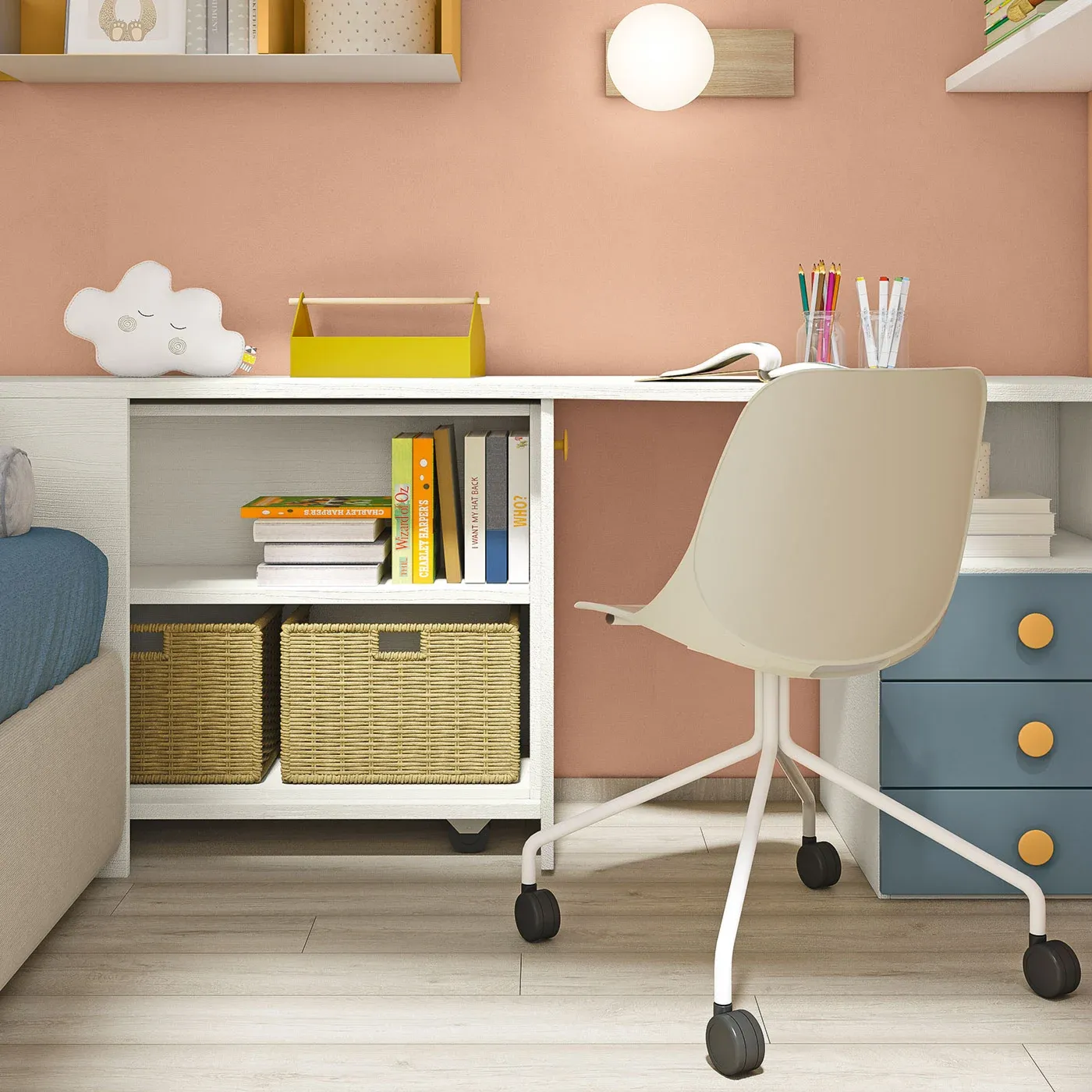 Infine è presente anche una lunga scrivania con carrello sottostante con un ripiano interno, una cassettiera a 3 cassetti ed un vano a giorno. Il mobile ideale per offrire una solida e funzionale postazione per lo studio o per i momenti di svago, con spazio più che sufficiente anche per poter contenere libri, quaderni e strumenti per la scuola.