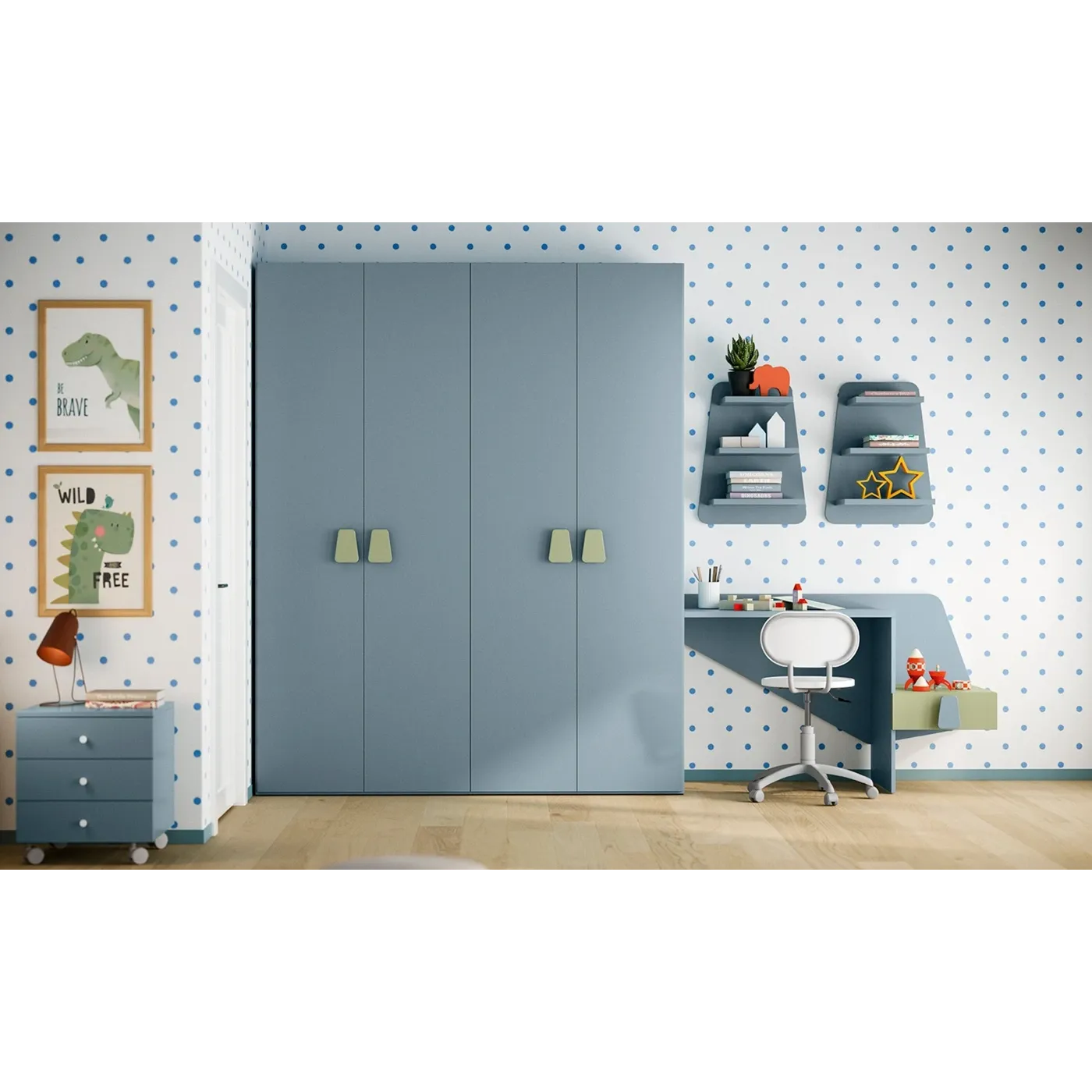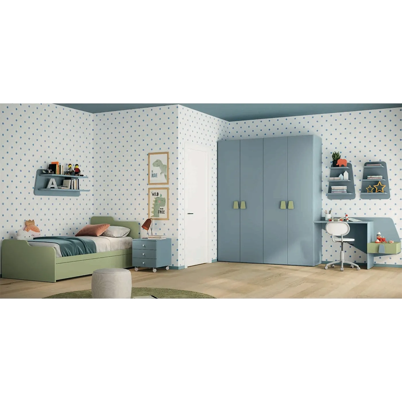 Camera per bambini e ragazzi della collezione Aquila con letto singolo con rete estraibile e testata e pediera sagomate. Armadio a 4 ante e con affiancata una scrivania con cassetto sospeso.