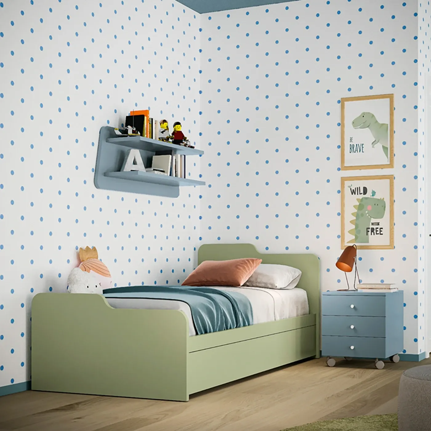 La camera si compone di un letto con seconda rete estraibile, testata e pediera sagomate. Le dimensioni del letto sono modificabili nelle sezioni sottostanti per adattarle a quelle delle reti a doghe. Assieme possono esservi inclusi alcuni optional come una cassettiera con rotelle.