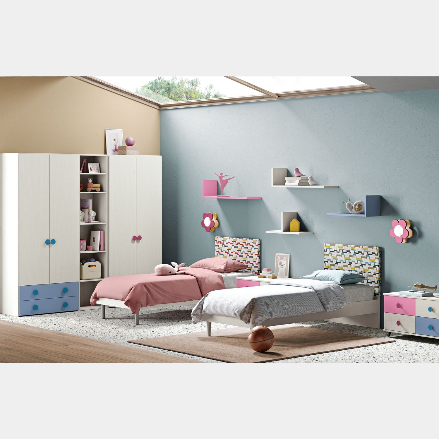 Cameretta per bambini in finitura Kiri, Ortensia e Avio, composta da un armadio a 4 ante battenti e libreria, due letti singoli e due comodini a 4 cassetti con ruote, finiture personalizzabili.