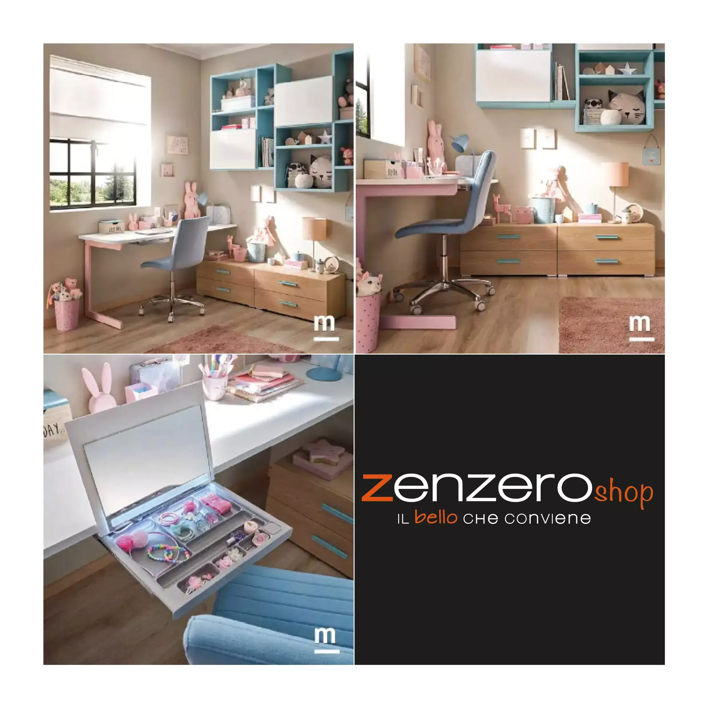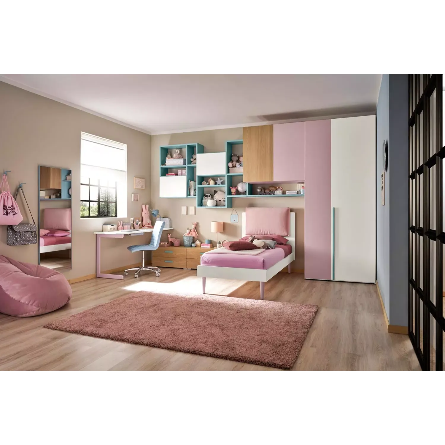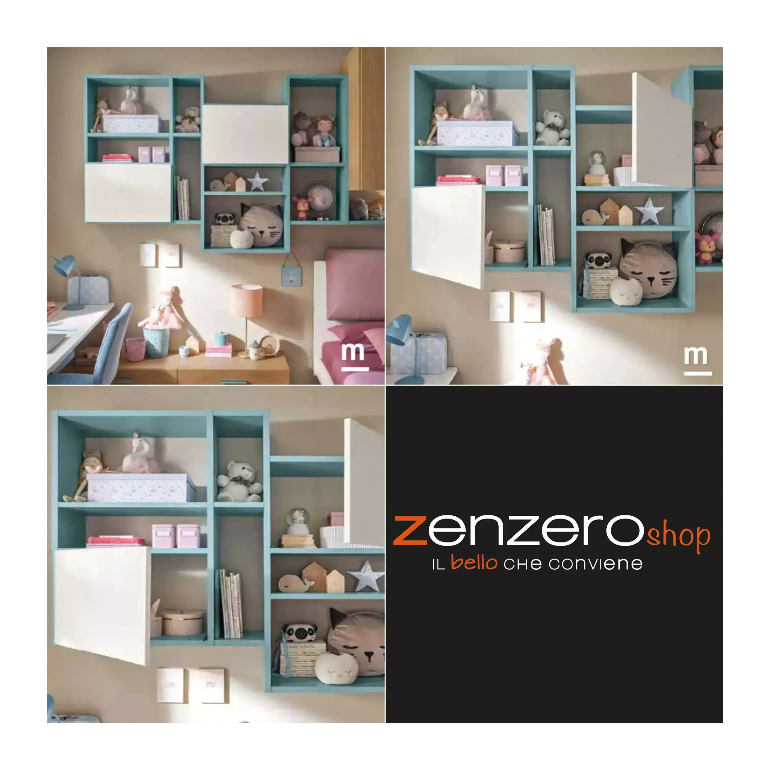 E' possibile completare la cameretta richiedendo la libreria sospesa con ante, la specchiera e gli appendiabiti tramite confituratore.