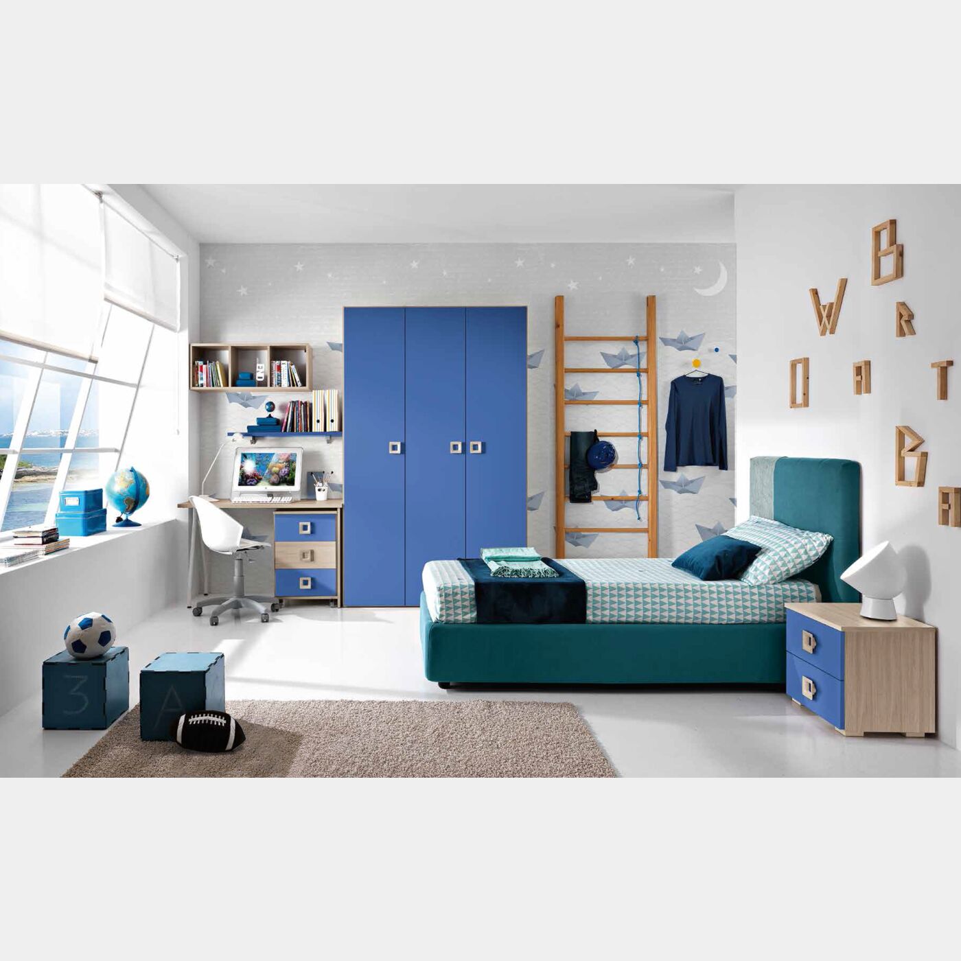 Cameretta Elia completa, finitura Olmo e Blu