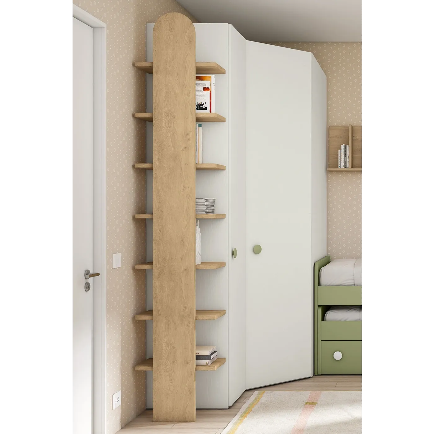 Cameretta per ragazzi con armadio ad angolo, Rovere bianco, Oliva e Royal oak