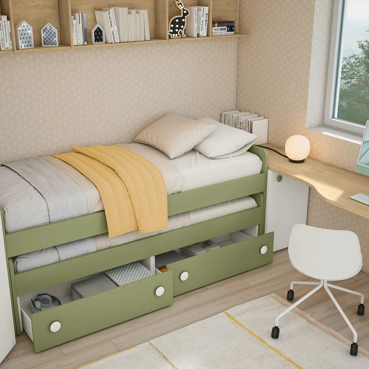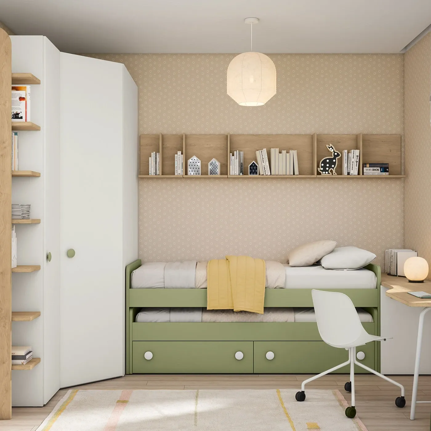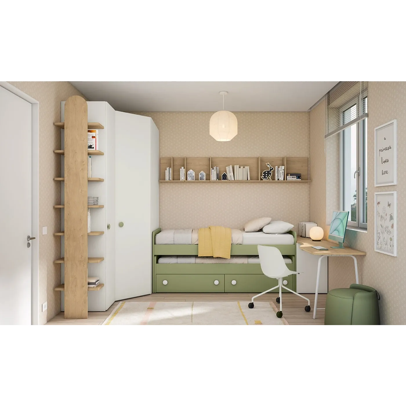 Cameretta per bambini e ragazzi in 3 finiture, Oliva, Rovere bianco e Royal oak liberamente modificabili. Si compone di letto con seconda rete a estrazione, scrivania con carrello e armadio angolare.