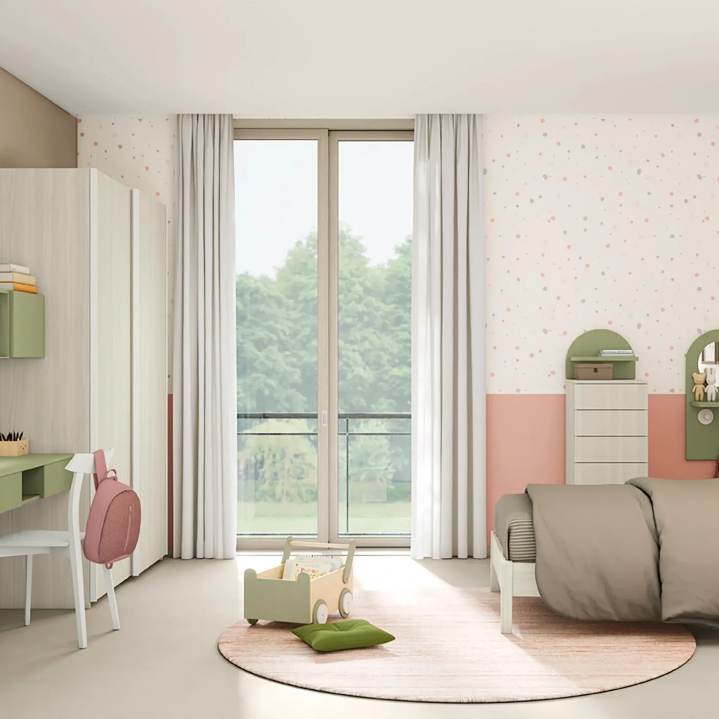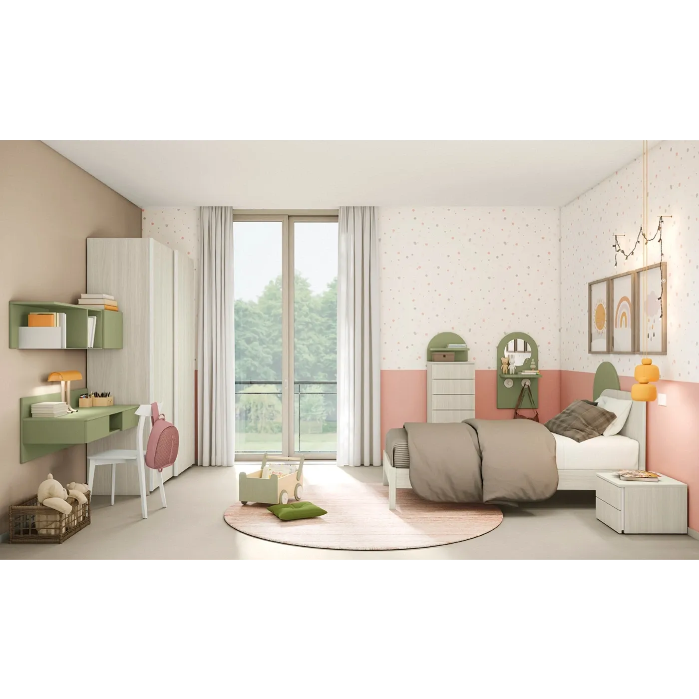 Cameretta per ragazzi dotata di comoda zona studio, di capiente armadio scorrevole e di un confortevole letto singolo. Corredabile con differenti optional.