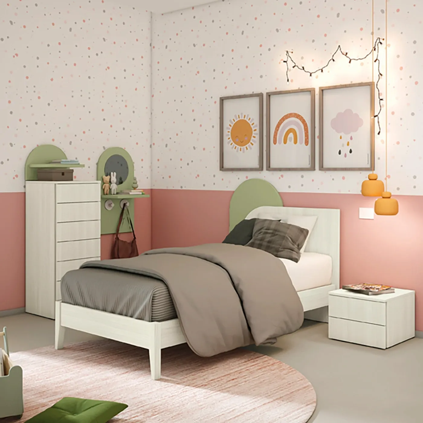 Infine è presente anche un letto singolo con testata in legno dalla particolare forma. Sia l'altezza dell'armadio come il letto e la sua rete possono essere richiesti in misure differenti da quelle standard tramite i relativi box sottostanti.