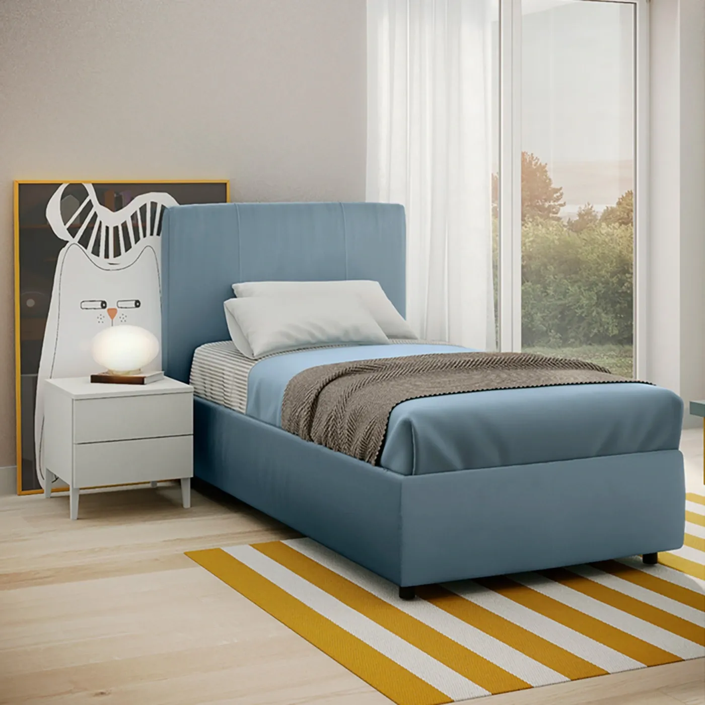 Infine, il letto in similpelle color Fiordaliso ad una piazza e mezza rappresenta l'articolo di maggior comodità della composizione, la più grande garanzia di confort che essa possa offrire. Può essere affiancato da un comodino a 2 cassetti con piedini.