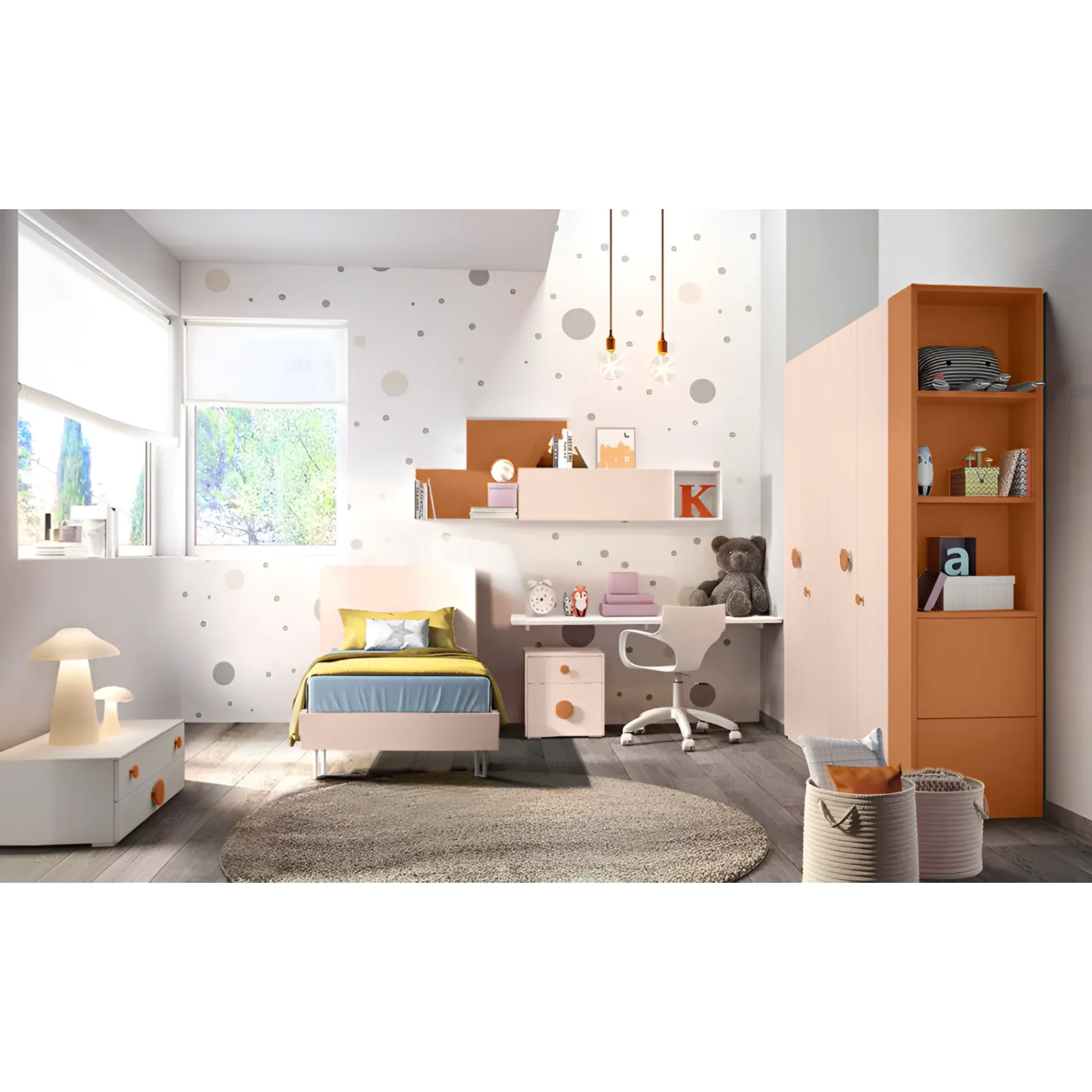 Colorata e allegra la cameretta per ragazza offre accoglienza e divertimento. Le accese finiture in Terracotta e Peonia si accostano al decicato Bianco frassino che illumina l'ambiente. La cameretta ragazza è composta dall'armadio, il letto singolo, il comodino e la scrivania.