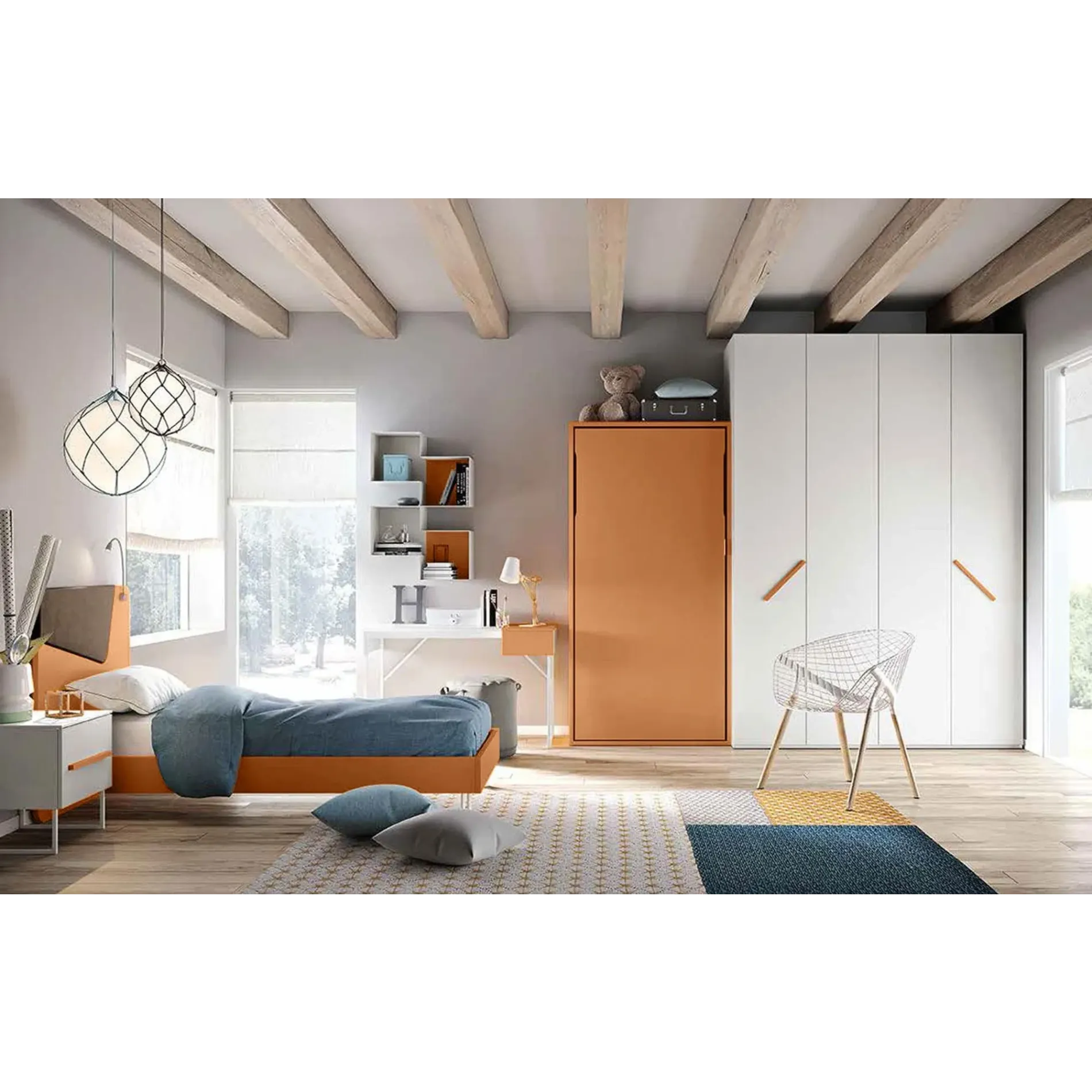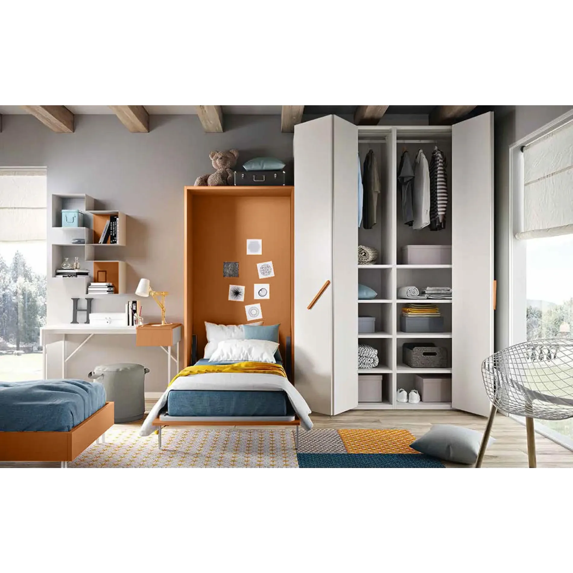 Cameretta ragazzi Terracotta e Bianco frassino, con armadio 4 ante apertura a libro