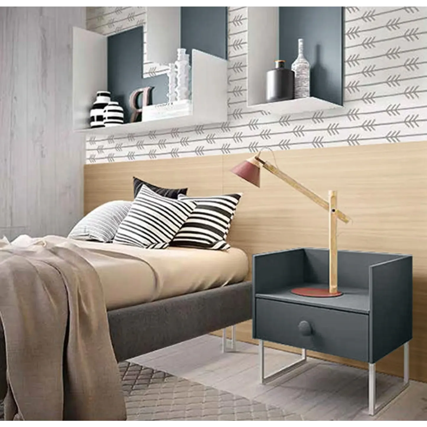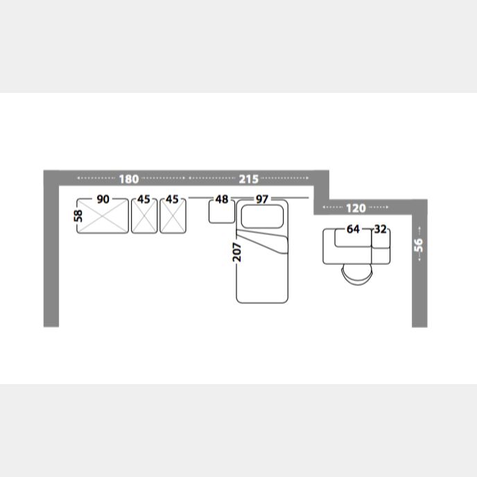 La cameretta è composta da un armadio a 4 ante battenti con cassetti, un letto singolo con giroletto imbottito e ampia testata rettangolare in legno ed infine un comodino con cassetto e gambe. Tramite apposito configuratore è possibile richiedere la scrivania, il pensile vasistas, il cubo sospeso e la composizione di mensole attrezzate, personalizzandone anche in questo caso le finiture.
