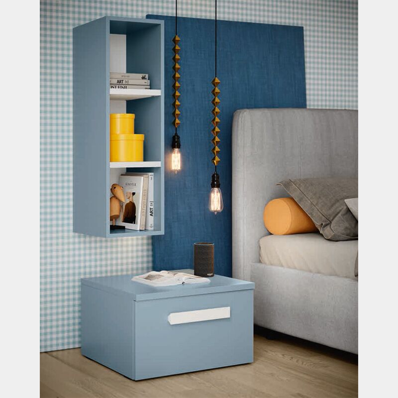 Il comodino ad un cassetto risulta pratico e funzionale. Grazie all'ampia capienza offre una valida soluzione di appoggio per tutti quei piccoli oggetti che vengono utilizzati alla notte. La finitura in Cenere si accosta piacevolmente al tessuto Grigio del letto, assicurando uno stile unico e originale.