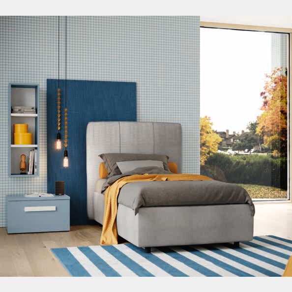 Il letto singolo in tessuto presenta un design semplice, a caratterizzarlo sono le due cuciture verticali poste nella testata. Grazie alla possibilità di variare la finitura si adatta ad ogni zona notte donando carattere. Il tessuto è Dorian. Viene fornito di base con la rete a doghe fissa ma si può richiedere attraverso il menù a tendina la rete contenitore.