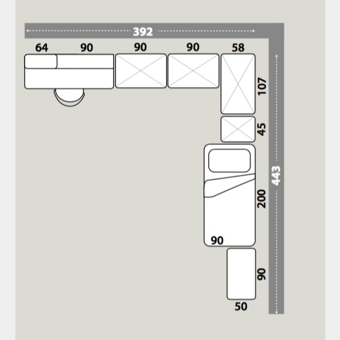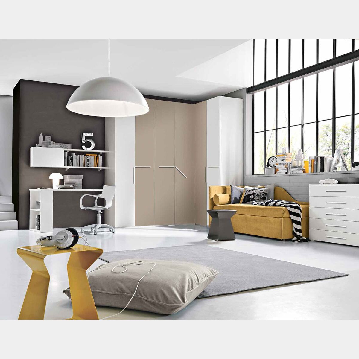 La cameretta nasce dalla richiesta di avere un arredo estremamente funzionale, che possa sfruttare tutto lo spazio a disposizione. Ideata per stanze dalle dimensioni limitate la cameretta è composta da un armadio angolare a 6 ante battenti e un divano letto con secondo ad estrazione. In qualche metro si hanno i principali complementi d'arredo che servono ad ogni ragazzo.