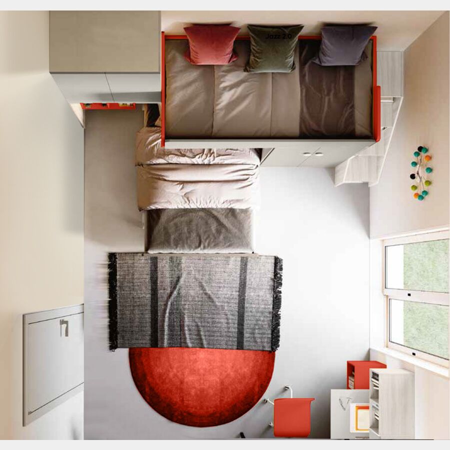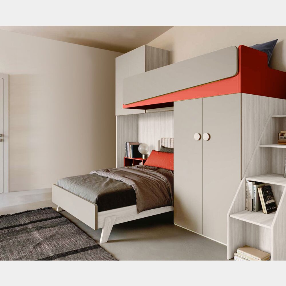 Cameretta soppalco con letto 1 piazza e mezza, finitura Bianco altea e Corallo