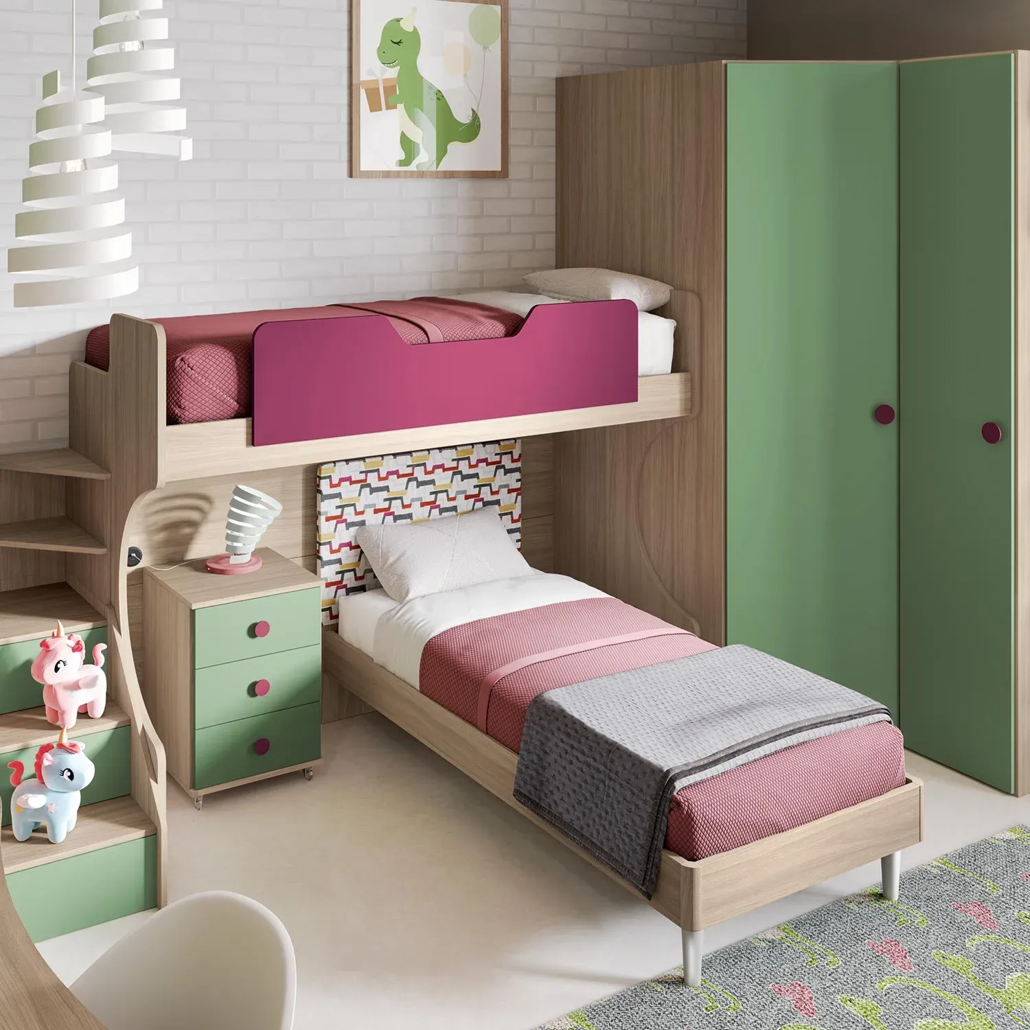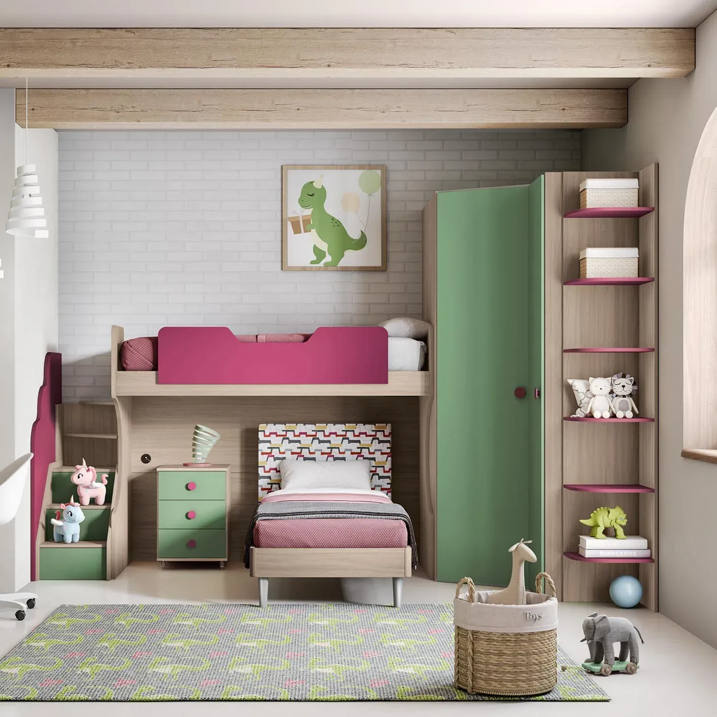Cameretta soppalco e armadio angolare, Olmo, Verde papua, Cranberry