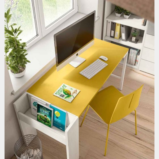 Scrivania con contenitore, Gialla grano e Larice Bianco. La moderna scrivania della collezione POP è disponibile nelle finiture Essenze e Colorati e piano e gambe possono essere scelti tra diversi colori, in questo caso ha il top / piana Giallo grano e gambe larice bianco e bianco laccato.La particolarità di questa scrivania sta nelle gambe a destra con telaio in metallo colore bianco, mentre le gambe a sinistra sono in legno con finitura larice bianco. Le gambe a sinistra hanno anche un portariviste.Nella scrivania per camerette per ragazzi si può scegliere come optional la sedia come in foto oppure un foro passacavi per tenere ordinata la scrivania e appoggiarla al muro.