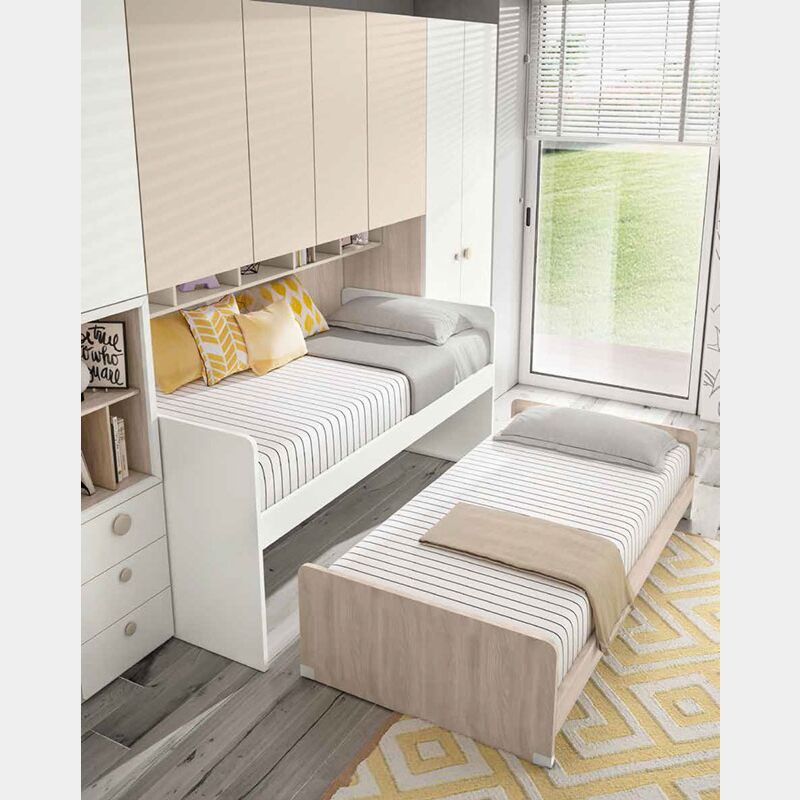 - Il letto è un'ottima soluzione salvaspazio: il letto multifunzionale è dotato di un secondo letto ad estarzione con ruote. Il secondo letto ha le seguenti dimensioni: L.199 P.99 H.48, questo permette di inserirlo sotto al letto principale quando non è utilizzato. Reti a doghe incluse.
