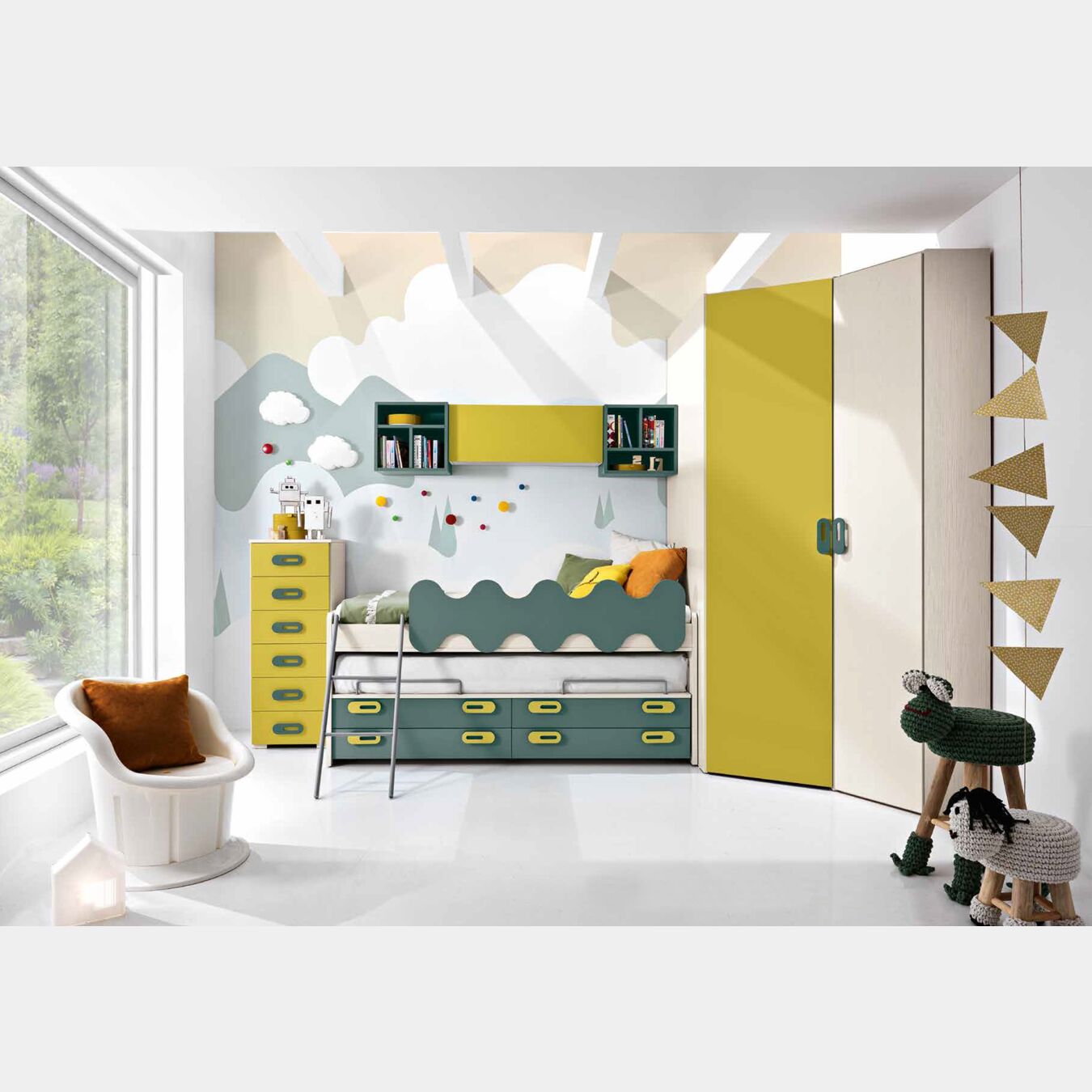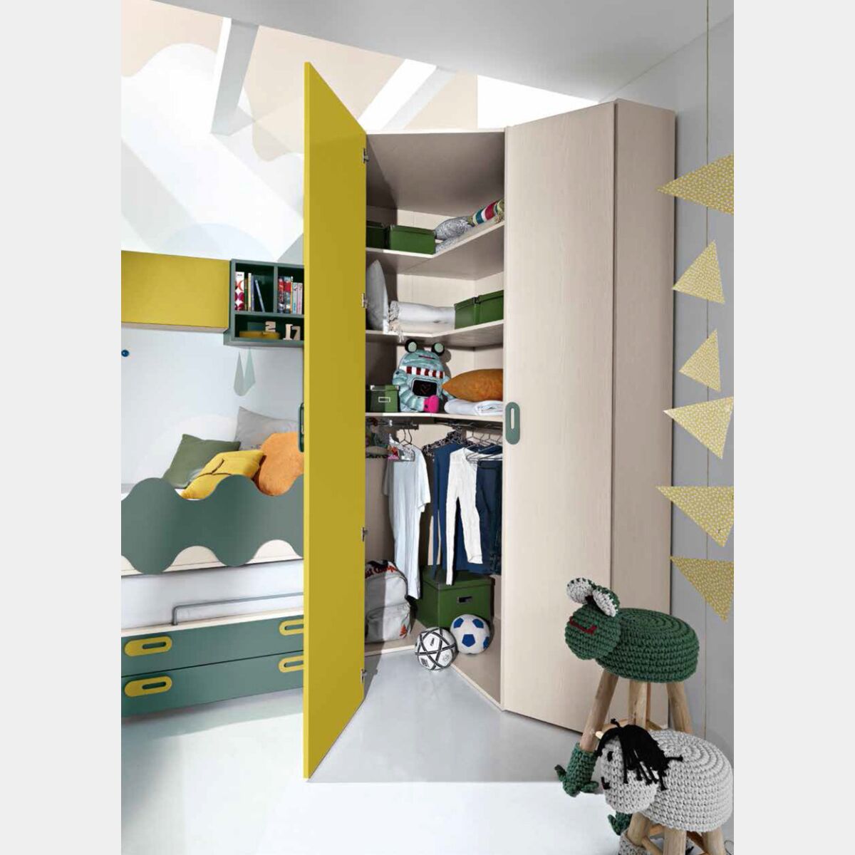 Cameretta per ragazzi completa Giacomo, finitura Betulla e Senape e Petrolio. Armadio ad angolo La struttura dell'armadio è in betulla, con un anta senape e una betulla e maniglie petrolio. La cabina ad angolo è comprensiva di Coppia Ripiani, Tubo appendiabiti e Luce.