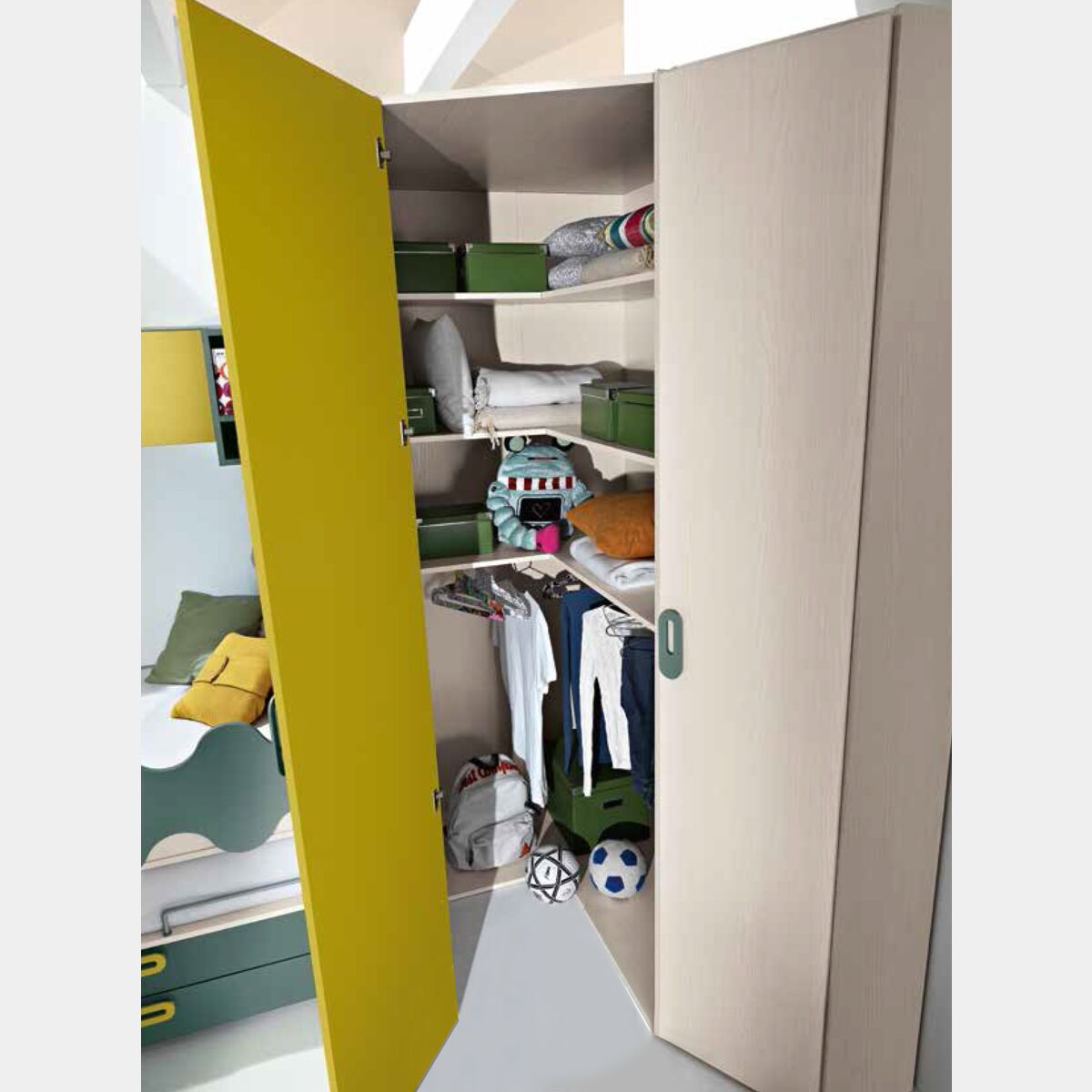 La finitura dell'armadio può essere cambiata sia nella scocca che nei frontali delle ante tramite il menù a tendina qui sotto. L'armadio ad angolo al suo interno ha una coppia di ripiani, un tubo appendiabito e luce. Letto multifunzione per ragazzi.