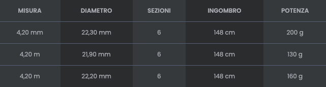 Sono dotate di Solid Tip per un'eccellente sensibilità ed essendo realizzate in 6 elementi, non prevedono l'uso di alcun anello scorrevole; il portamulinello è a vite, il tappo posteriore in gomma e gli anelli doppio ponte sono SiC, durevoli e robusti.
